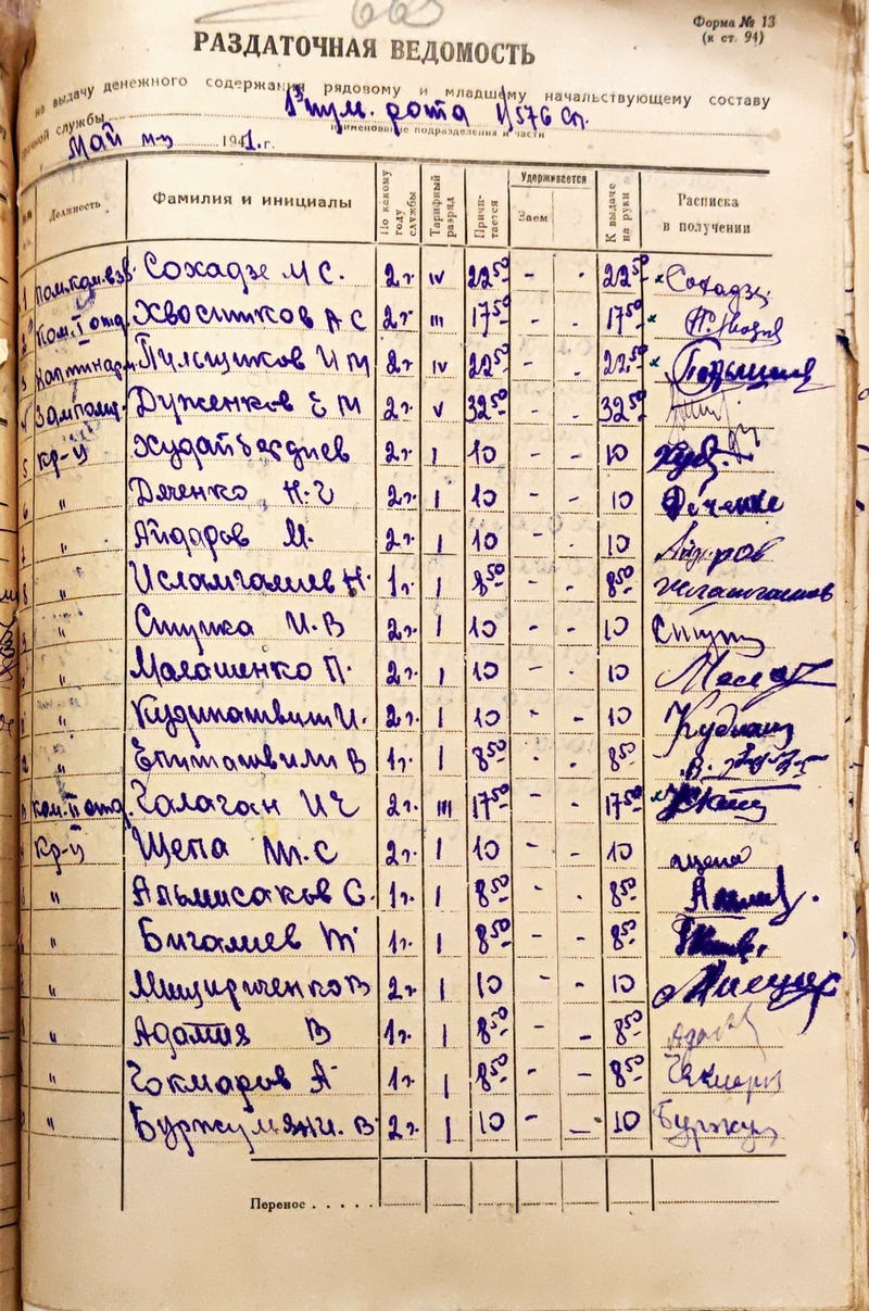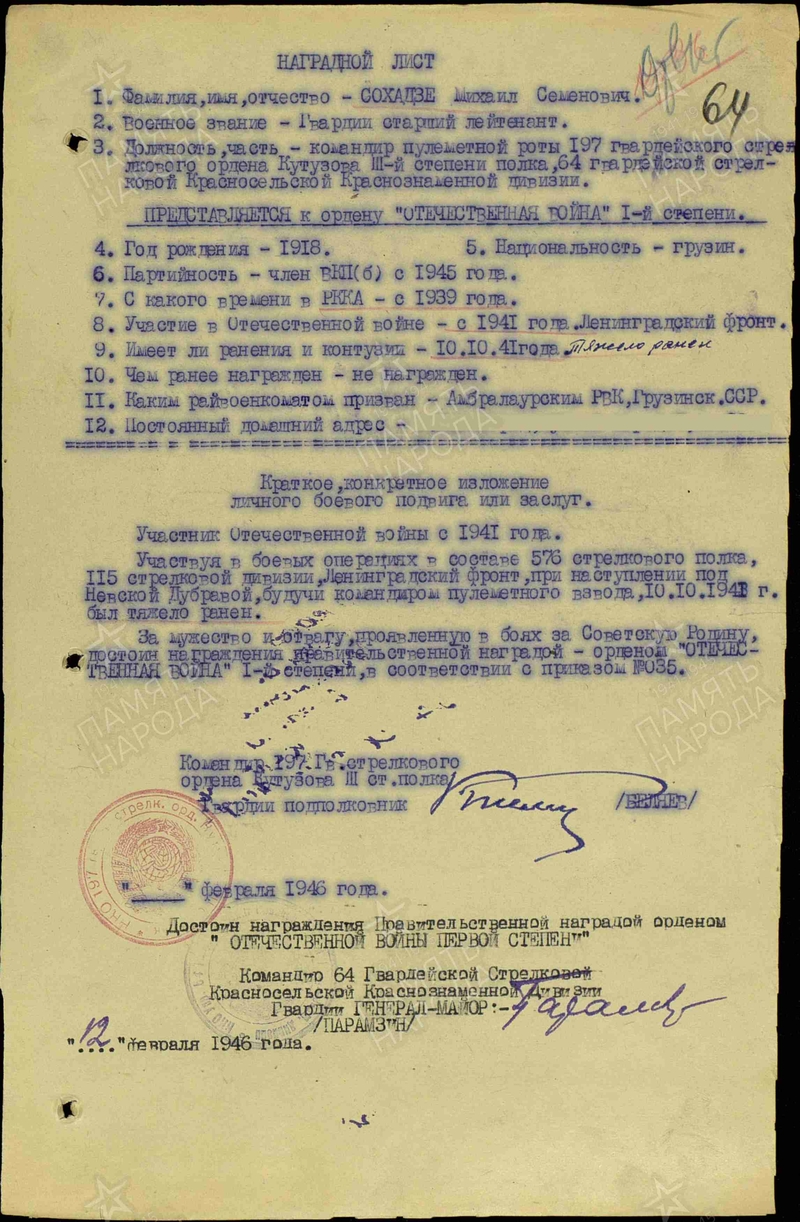 1) Помощник командира 1 взвода, сержант Сохадзе Михаил Семёнович 09.09.1918г.р. Призван: 22.12.1939 года, Амбролаурский РВК, Грузинская ССР, Амбролаурский р-н. Уроженец: Грузинская ССР, Амбролаурский р-н, с. Цахи. Воевал. Тяжело ранен в бою 10.10.1941 года на Невском Пятачке. В дальнейшем проходит в званиях от лейтенанта до подполковника. Неоднократно награждён. Войну прошёл. Службу закончил в 1970 году.