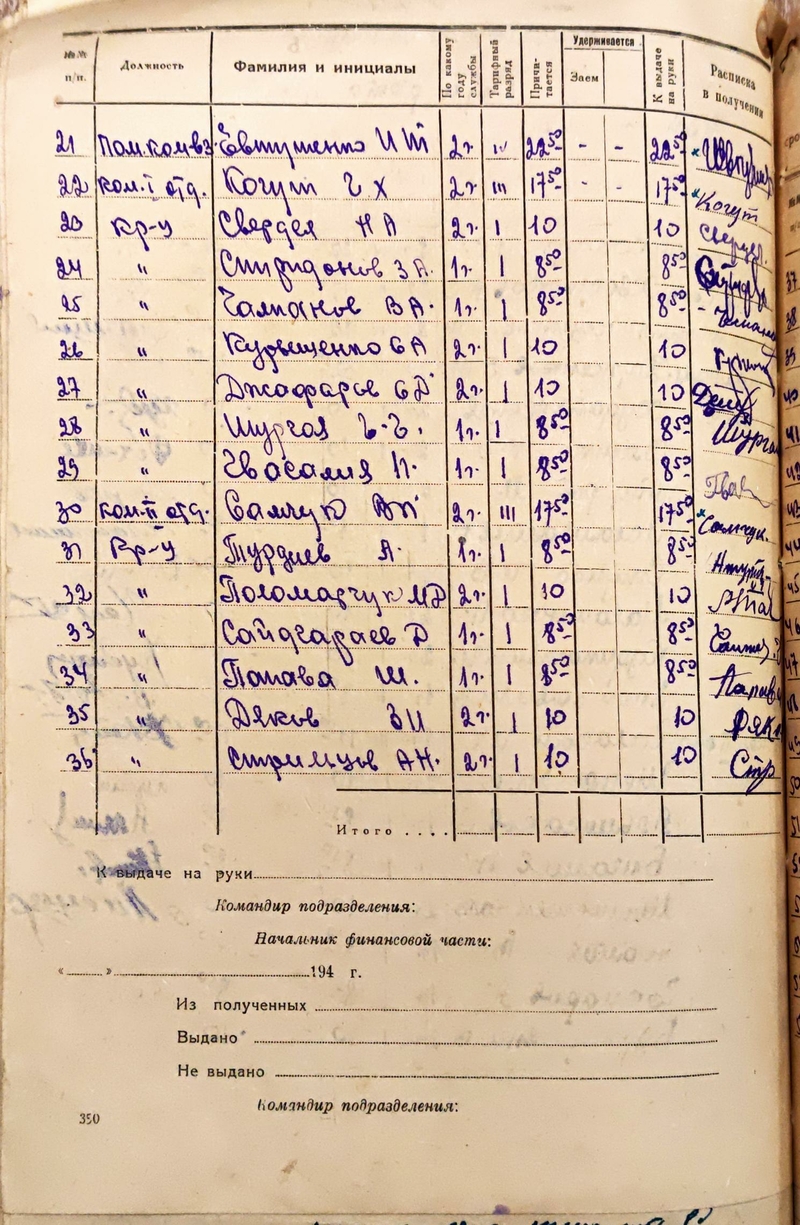 47) Командир 2 отделения 3 взвода, сержант Танасейчу К. В. В расчётной ведомости за июнь числится как Танасейчук К. Г. Это Танасейчук Корней Игнатьевич 1918 г.р. Призван: в 1939 году, Ладыжинский РВК, Украинская ССР, Киевская обл., Ладыжинский р-н. Уроженец: Украинская ССР, Киевская обл., Ладыжинский р-н. Ранен в бою 03.08.1941 года в Куйсма. Проходит по ЭГ2222, выбыл 06.08.1941 года в ЭГ2009. После госпиталя воевал в 19 ждбр. В 1943 году награждался. Больше информации нет.