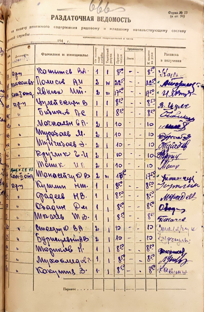 49) Пулемётчик Фадеев Н. В., при этом в росписи отчётливо видна в имени буква «М». В расчётной ведомости за июнь числится как Фадеев Н. П. Воин не идентифицирован.