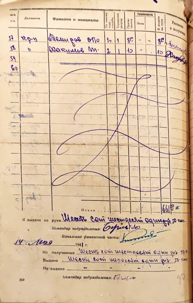 Расчётная ведомость 1 пулемётной роты за май 1941 года.