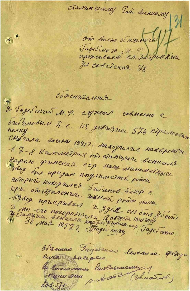 41) Пулемётчик Бибиков Пётр Севостьянович 1920 г.р. Призван: __.10.1940 Сталинский РВК, Киргизская ССР, Фрунзенская обл., Сталинский р-н. Уроженец: Киргизская ССР, Фрунзенская обл., Петровский р-н, с. Петровка. Мать: Бибикова Пелагея Сергеевна. Со слов сослуживца «Убит в бою 17.08.1941 в районе ст. Венкиля. Похоронен сослуживцами в районе ст. Венкиля.» Это станция Инкеля, вероятно, имелось в виду «убит в Инкеля». Ныне это ст. Зайцево. Сослуживец ошибся с датой. Это произошло 07 августа 1941 года. По анкете Сталинского РВК за 1957 год считается пропавшим без вести.