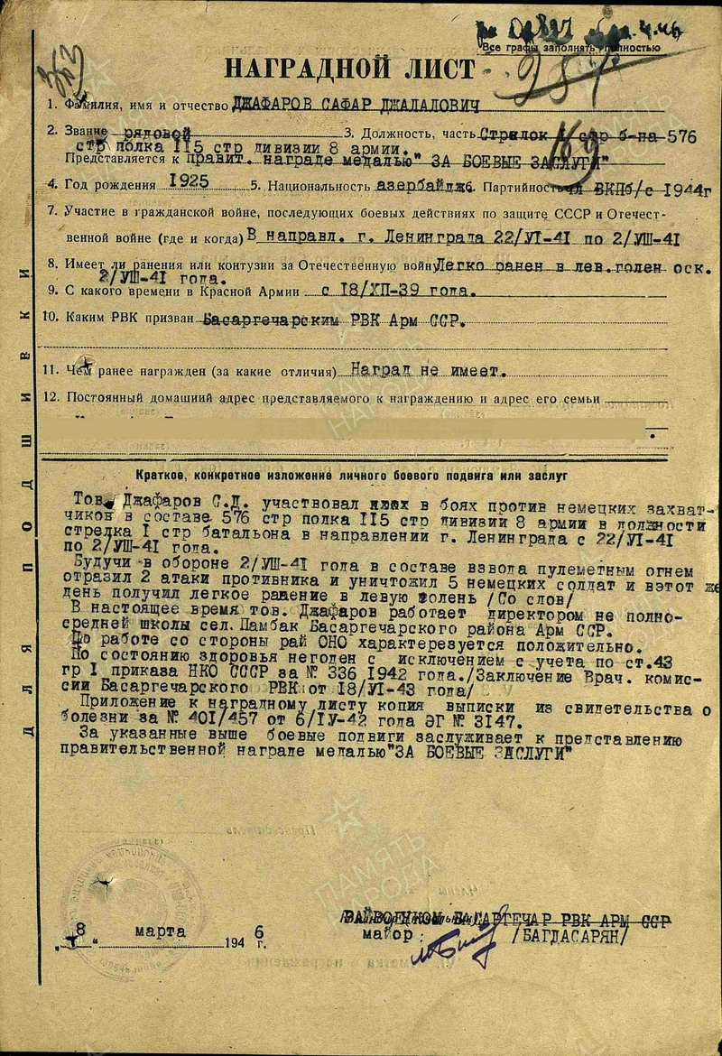 27) Пулемётчик Джафаров Сафар Джалалович 1915 г.р. Призван: 18.12.1939 года, Басаргечарский РВК, Армянская ССР, Басаргечарский р-н. Ранен в бою 02.08.1941 года в Куйсма. Проходит по ЭГ2222, выбыл 07.08.1941 года в больницу им. Мечникова. Эвакуирован в тыл 20.08.1941 года. Демобилизован по ранению. Войну прошёл. Читать наградной лист.