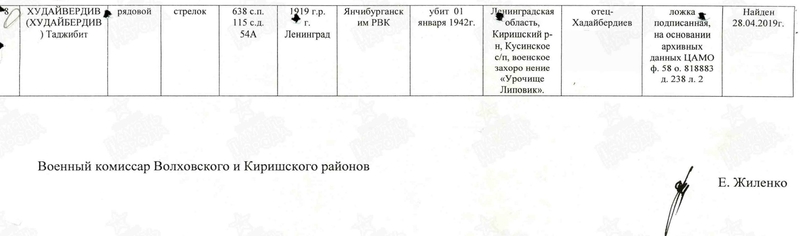 5) Пулемётчик Худайбердиев Татджибит 1919 г.р. Призван: в 1939 году, Янги-Курганский РВК, Узбекская ССР, Наманганская обл., Янги-Курганский р-н. Убит в бою 01.01.1942 года в Киришском районе, Ленинградской области, у деревни Ларионов Остров. Найден в 2019 году. Опознан по подписной ложке. Похоронен на воинском захоронении «Урочище Липовик».