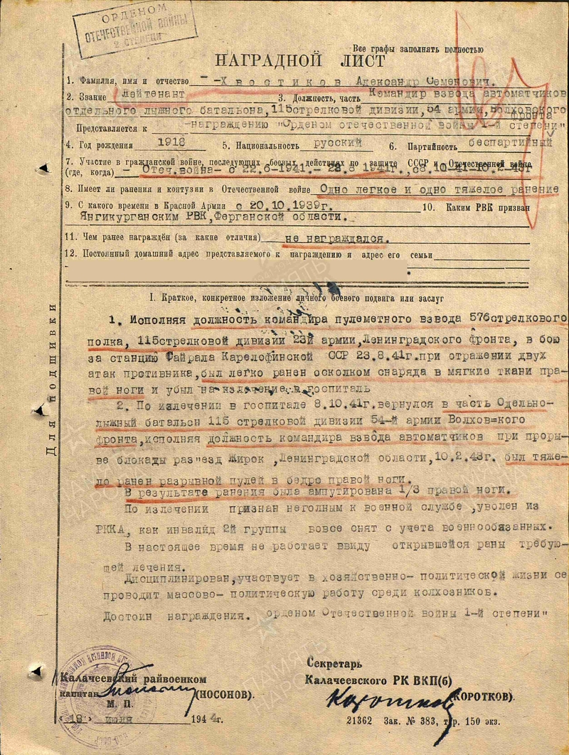 2) Командир 1 отделения 1 взвода, сержант Хвостиков Александр Семёнович 1918 г.р. Призван: 20.10.1939 года, Янги-Курганский РВК, Узбекской ССР, Ферганская обл., Янги-Курганский р-н. Уроженец: Воронежская обл., Калачеевский р-н, сл. Подгорная. Ранен в бою 23.08.1941 года. Вернулся в строй 08.10.1941 года в звании лейтенант. Воевал. Был тяжело ранен 10.02.1943 года. Демобилизован по ранению. Войну прошёл. Читать наградной лист.