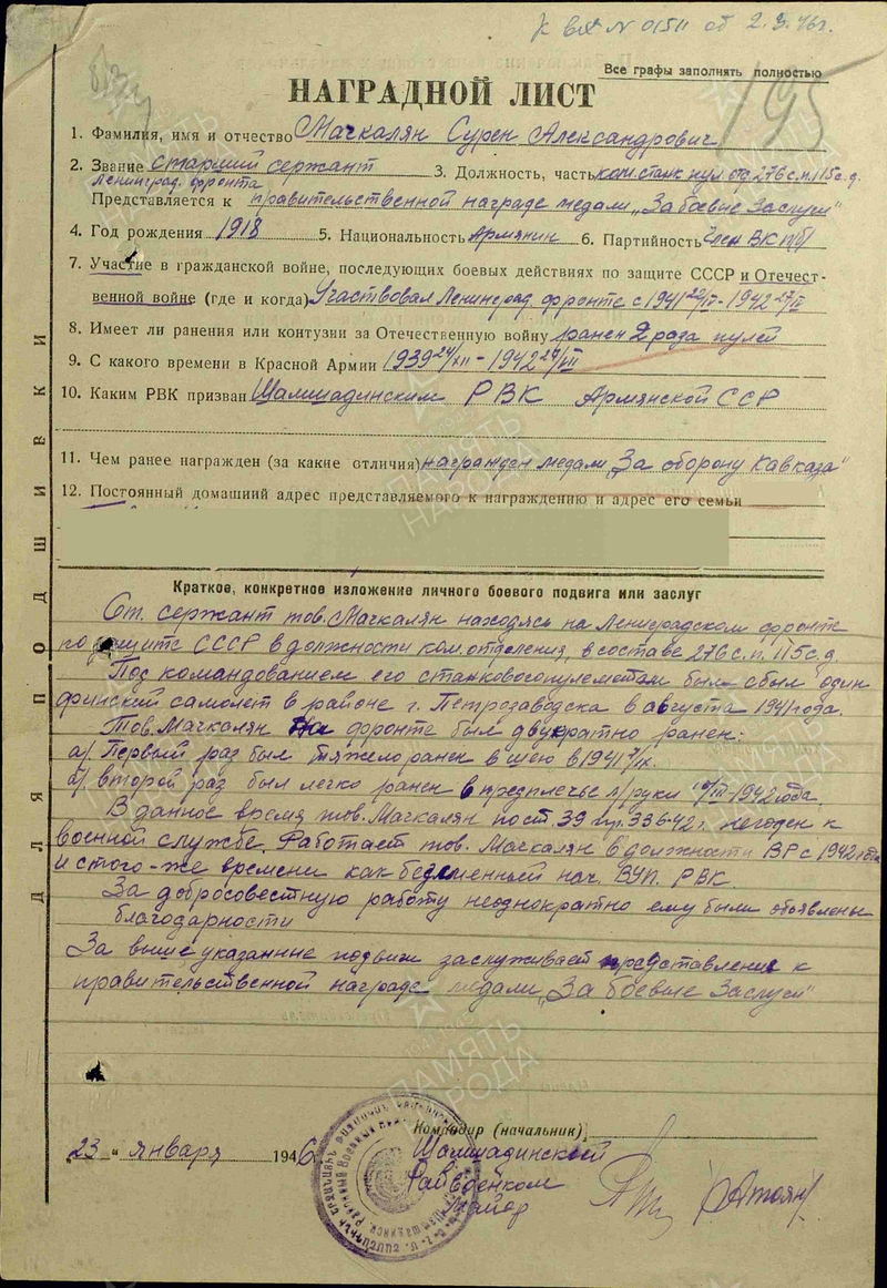 42) Пулемётчик Мачкалян Сурен Александрович 1918 г.р. Призван: 24.12.1939 года, Шамшадинский РВК, Армянская ССР, Шамшадинский р-н. Уроженец: Армянская ССР, Шамшадинский р-н, с. Тауз. Воевал. Был дважды ранен. Демобилизован по ранению. Войну прошёл. Читать наградной лист.