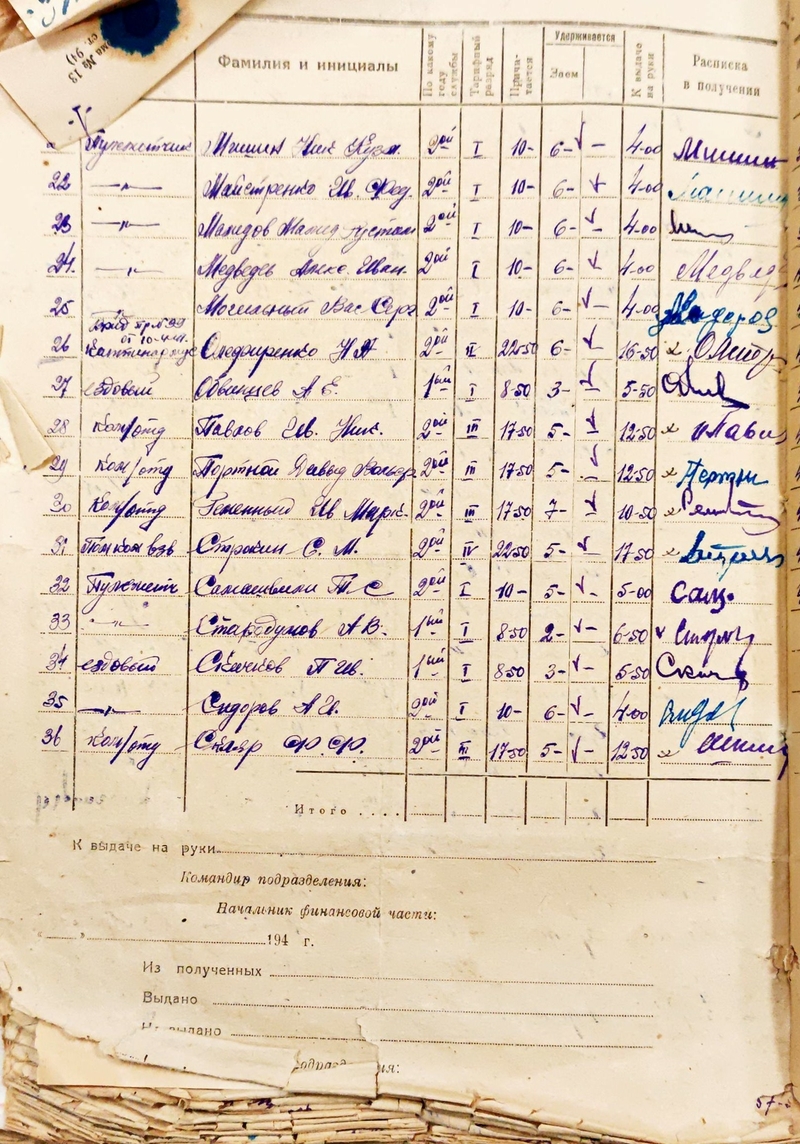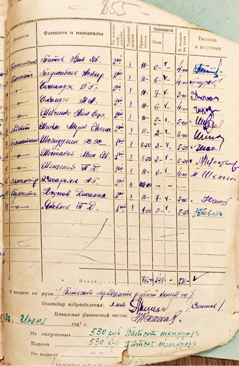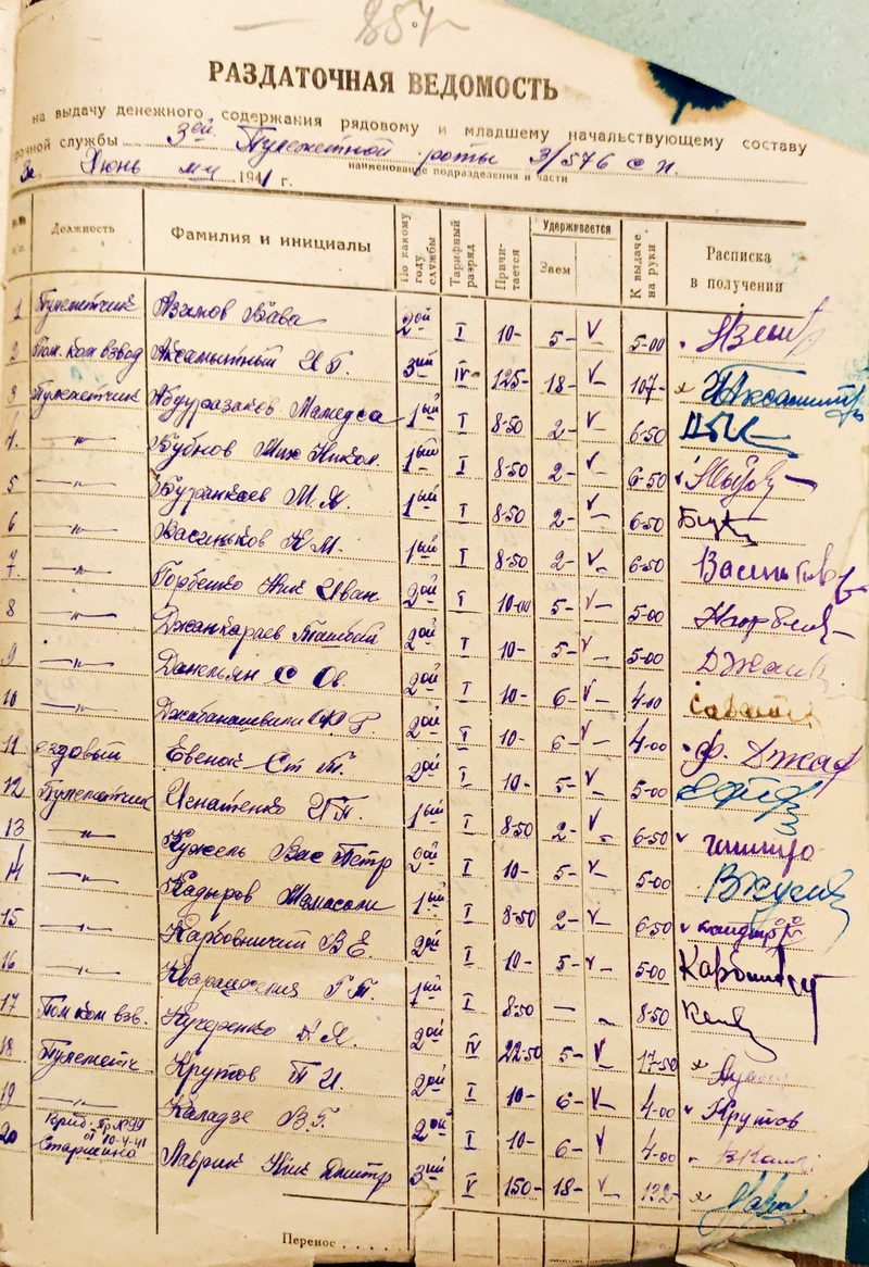 Расчётная ведомость 3 пулемётной роты 576 полка за июнь 1941 года.