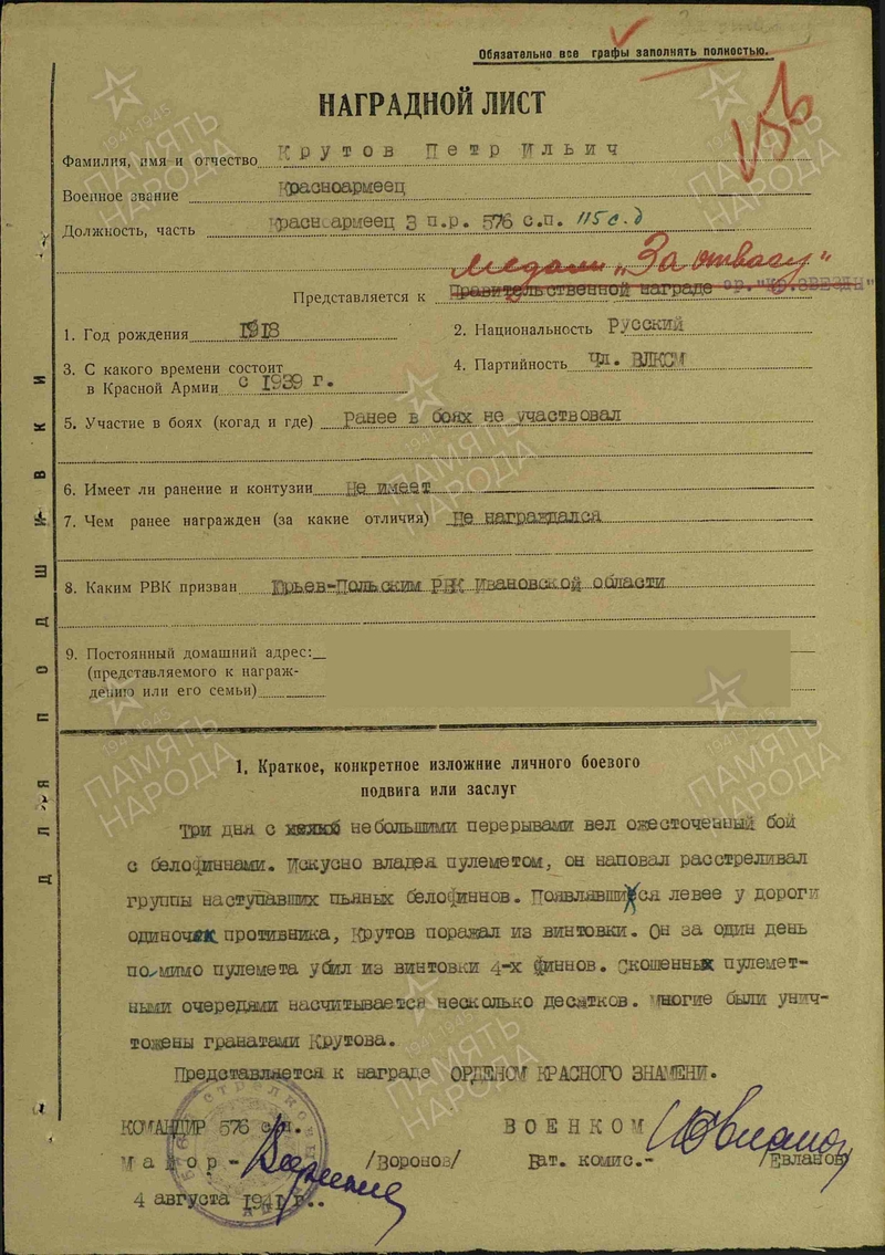 18) Пулемётчик Крутов Пётр Ильич 1918 г.р. Призван: в 1939 году, Юрьев-Польский РВК, Ивановская обл., Юрьев-Польский р-н. Уроженец: Ивановская обл., Гаврилово-Посадский р-н. Ранен в бою в августе 1941 года. Проходит по ЭГ2222. Выбыл 25.08.1941 года в ВСП18/38/2. Награждён медалью «За отвагу». Читать наградной лист. В дальнейшем воевал ст. сержантом. Убит в бою 23.03.1943 года в Смоленской области. Похоронен: Смоленская обл., Всходский р-н, д. Карповка.