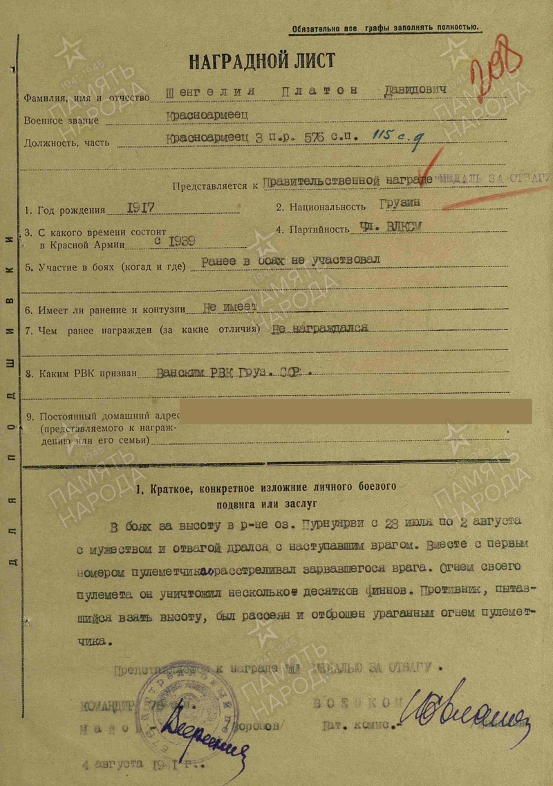 45) Пулемётчик Шенгелия Платон Давидович 1917 г.р. Призван: в 1939 году, Ванский РВК, Грузинская ССР, Ванский р-н. Уроженец: Грузинская ССР, Ванский р-н, с. Шуамта. Ранен в бою в августе 1941 года. Проходит по ЭГ2222, выбыл 19.08.1941 года в ВСП. Дальше проходит по ЭГ2493. Вероятно, демобилизован по ранению. За бой в Куйсма, в районе озера Хийденярви награждён медалью «За Отвагу». После войны награждался. Войну прошёл.