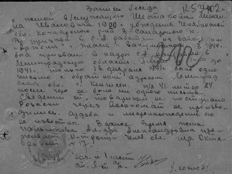 44) Пулемётчик Шестаков Михаил Иванович 1920 г.р. Призван: в 1940 году, Кочкарский РВК, Челябинская обл., Кочкарский р-н. Уроженец: Челябинская обл., Кочкарский р-н, г. Пласт. По спискам Кочкарского РВК за 1948 год считается пропавшим без вести в 1941 году. Пропал без вести (погиб) в августе 1941 года.