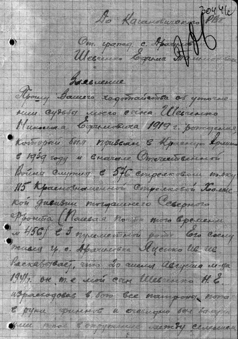 41) Пулемётчик Шевченко Николай Ефимович 1919г.р. Призван: в 1939 году, Кагановичский РВК, Украинская ССР, Киевская обл., Кагановичский р-н. Уроженец: Украинская ССР, Киевская обл., Вышгородский р-н, Драчиловка. Шевченко Ефим Талимонович. Письменная связь прекратилась в июле 1941 года. По спискам Кагановичского РВК за 1947 и 1948 года считается пропавшим без вести. Пропал без вести (погиб) в августе 1941 года.