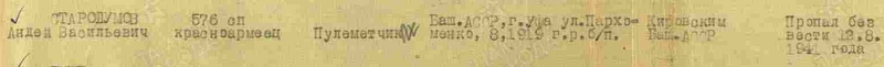 33) Пулемётчик Стародумов Андрей Васильевич 1919 г.р. Призван: Кировский РВК, Башкирская АССР, г. Уфа, Кировский р-н. Уроженец: Башкирская АССР, г. Уфа. По спискам 115 СД пропал без вести 12.08.1941 года.
