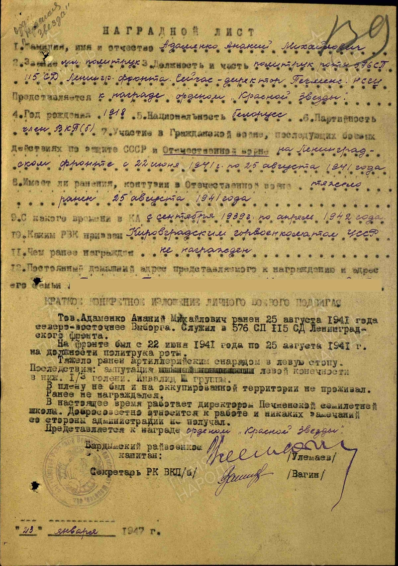 62) Красноармеец, помощник политрука Адаменко Ананий Михайлович 1918 г.р. В дальнейшем в должности мл. политрук, политрук роты. Уроженец: Белорусская ССР, Гомельская обл., Петриковский р-н, д. Бринёв. Призван: УССР, Кировоградская обл., г. Кировоград. Ранен в бою 25 августа 1941 года. Проходит по ЭГ1170. Выбыл из госпиталя 15.09.1941г. в военный госпиталь №92 в Ленинград. Демобилизован по ранению 16.03.1942 года. Награждён. Работал учителем, директором школы. Заслуженный учитель РСФСР.