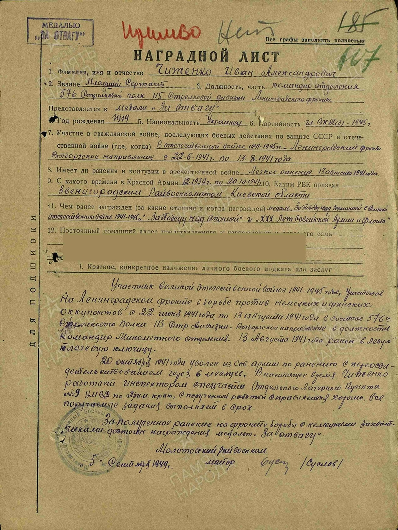 71) Красноармеец Богун Владимир Данилович 1918 г.р. Уроженец: УССР, Кировоградская обл., Новгородковский р-н, с. Вербюшки. По спискам 115 СД убит в бою 03.10.1941 года на Невском Пятачке с формулировкой «оставлен на поле боя». В реальности не погиб, проходит по госпиталю ЭГ991, эвакуирован в тыл 18.01.1942г. Выбыл из госпиталя 22.06.1942 года. В дальнейшем воевал на Дальневосточном фронте в звании ефрейтор. Награждён. Войну прошёл.