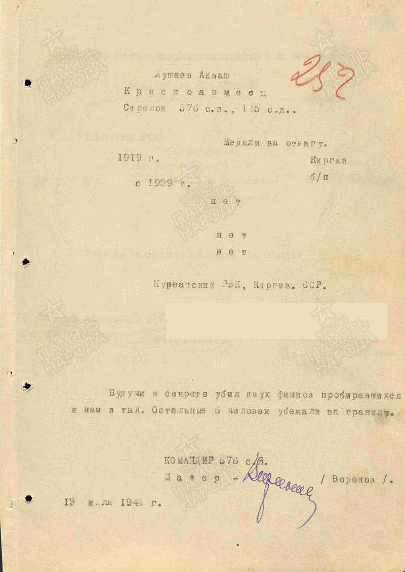 42) Красноармеец Ахметов Тоджив(б)ай 1919 г.р. Уроженец: Киргизская ССР, Ошская обл., Курбашский р-н, с. Карауль. Ранен в бою 09.10.1941г. в Невской Дубровке. Выбыл из госпиталя 21.11.1941г. в 8 Армию. Дальнейшая судьба не известна.