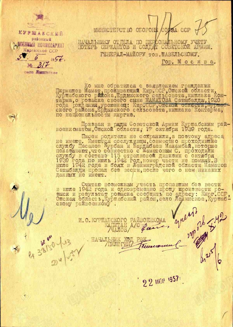 69) Красноармеец Маматов Саты Бады (Сатыбвлды) 1919 (1920) г.р. Уроженец: Киргизская ССР, Ошская обл., Куршабский р-н. Ранен в бою 13.08.1941г. Проходит по ЭГ 2222. Выбыл из госпиталя 27.08.1941г. в ОВК. По спискам РВК считается пропавшим без вести с июля 1942 года.