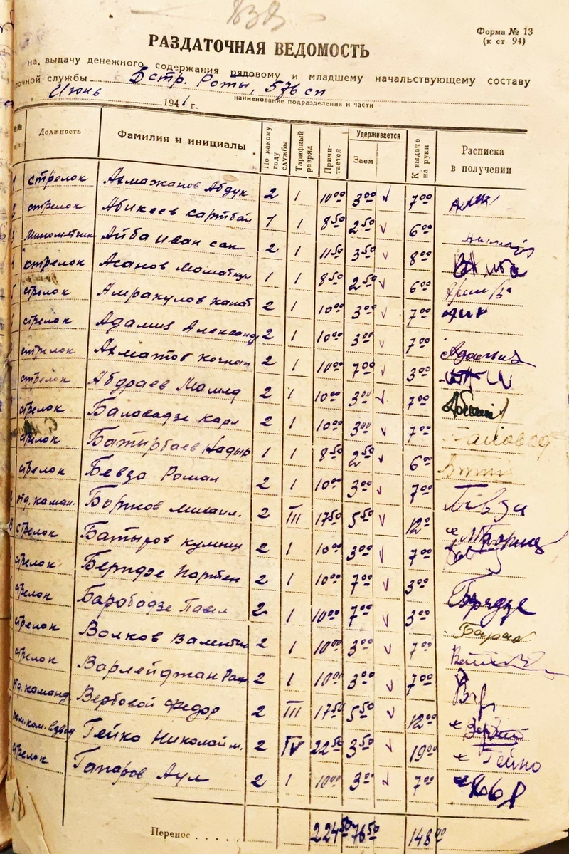 Расчётная ведомость 5 стрелковой роты за июнь 1941 года.