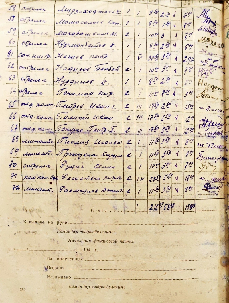58) Красноармеец, стрелок Мамасалиев Кандр. Ранен в бою в августе 1941 года. проходит по ЭГ2222, выбыл 29.08.1941 года в ВСП1009. Далее проходит по СЭГ1170, выбыл 08.09.1941г. в ППГ731. Дальнейшая судьба не известна.