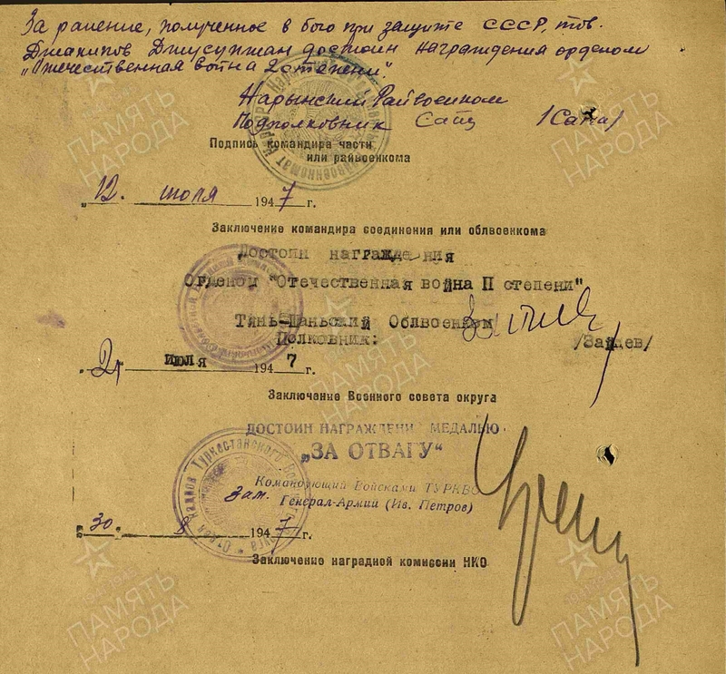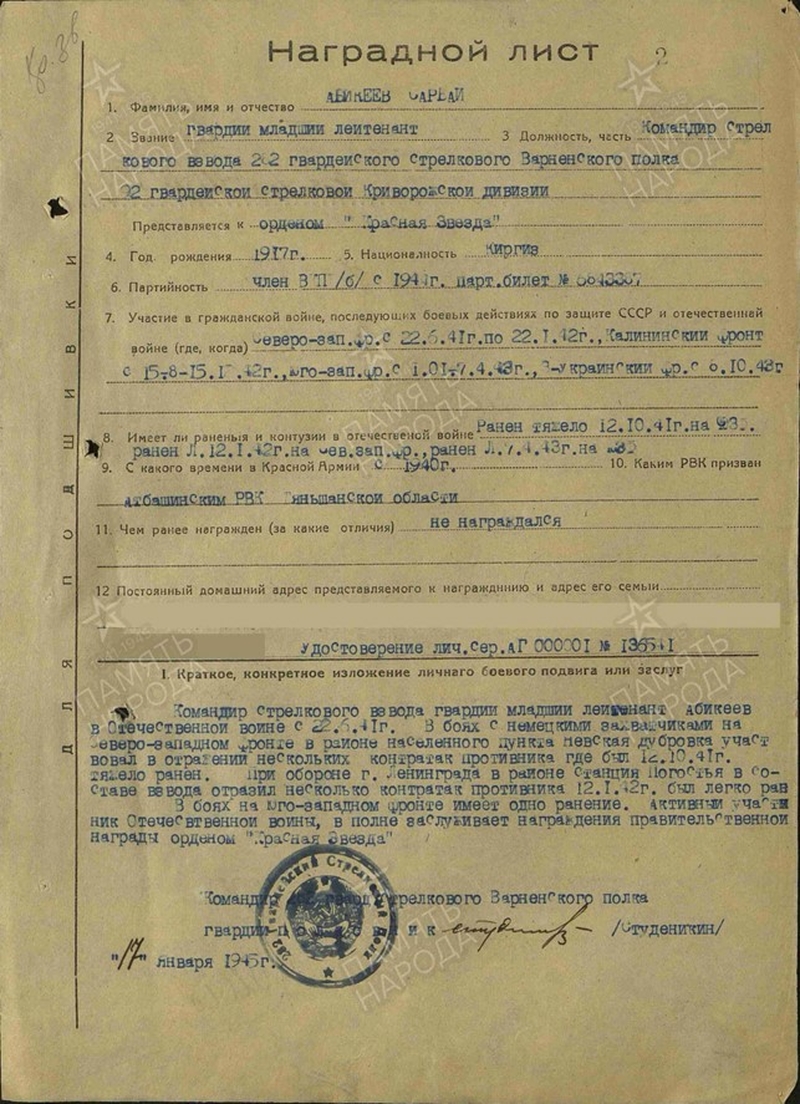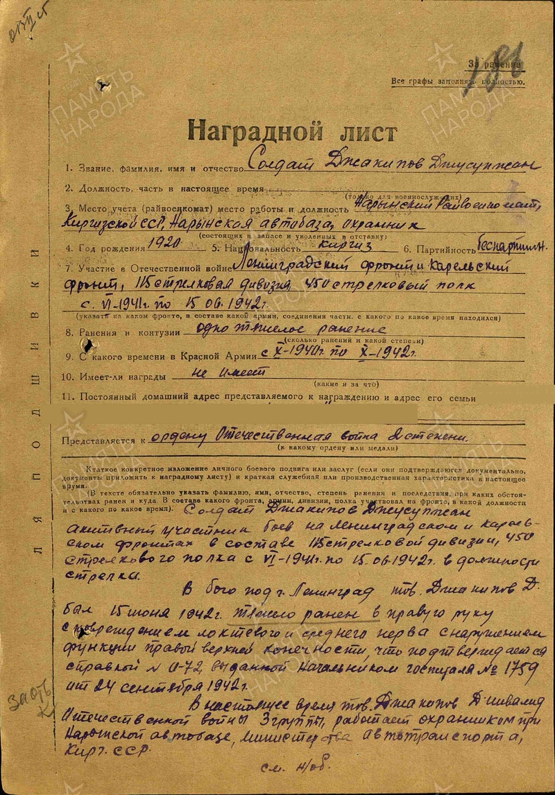 30) Красноармеец, стрелок Джакипов Джусупжан 1920 г.р. Уроженец: Киргизская ССР, Тянь-Шаньская обл., г. Нарын. Воевал. Был тяжело ранен 15.06.1942 года. Демобилизован по ранению. Войну прошёл. После войны неоднократно награждался.