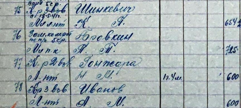 С 18 мая 1941г. обязанности командира 5 стрелкой роты 576 СП исполняет командир 3 взвода 4 стрелковой роты, мл. лейтенант Шинкевич Кузьма Павлович 1911 г.р. Уроженец: УССР, Одесская обл., Арбузинский р-н, с. Николаевка. Жена: Ковилина Мария Никитична. Ранен в бою в августе 1941г. Проходит по ЭГ2222, далее ЭГ2994, выбыл 26.08.1941г. в ВСП46. В дальнейшем воевал. Погиб в бою в звании лейтенант, командир батальона, 20.02.1944г. в Белоруссии.