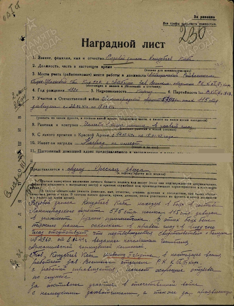 39) Красноармеец, ручной пулемётчик Конурбаев Кава 1920 г.р. По наградным документам имя Каба. Уроженец: Киргизская ССР, Тянь-Шаньская обл., Атбашинский р-н, с. Атбаши. Тяжело ранен в бою до 25 августа 1941 года. Проходит по ЭГ2222, выбыл 25.08.1941 года в ВСП1118. Демобилизован по ранению 05.01.1942 года. После войны награждался. Войну прошёл.