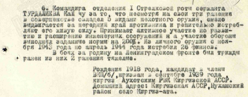 80) Красноармеец, стрелок Турдалев Койчи. ЭтоТурдалиев Койчи 1918 г.р. Уроженец: Киргизская ССР, Ошская обл., Наукатский р-н, с. Киргиз-Ата. Ранен в бою 29.08.1941года. Проходит по госпиталям. Выбыл из госпиталя 29.10.1941 года в НОГ. В дальнейшем воевал в звании сержант на Ленинградском фронте. Награждён медалью «За отвагу».