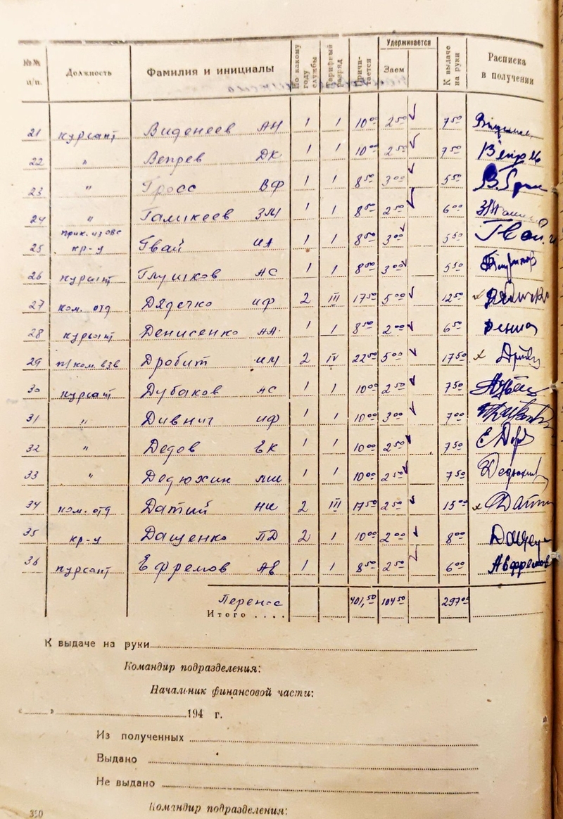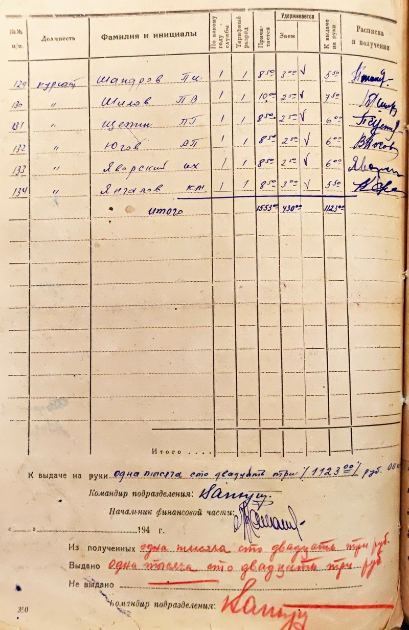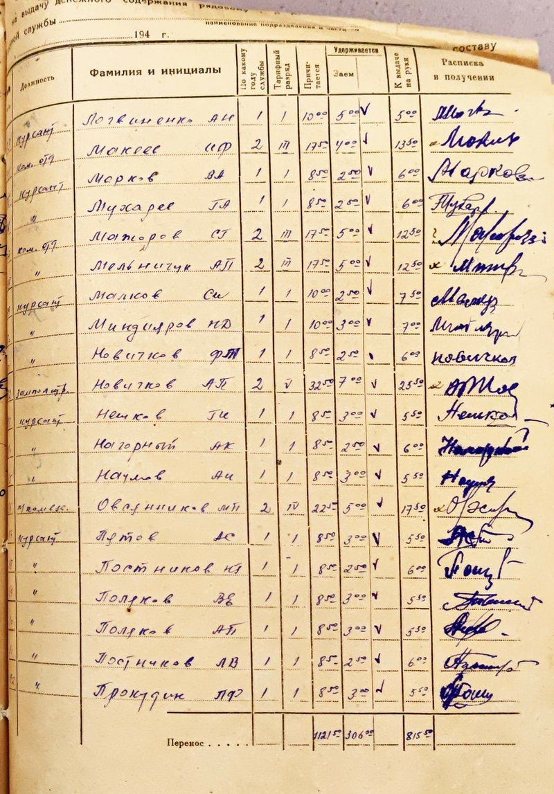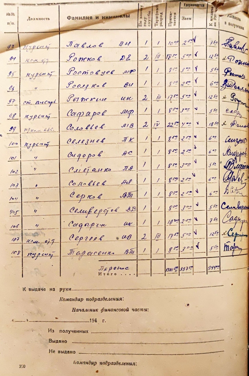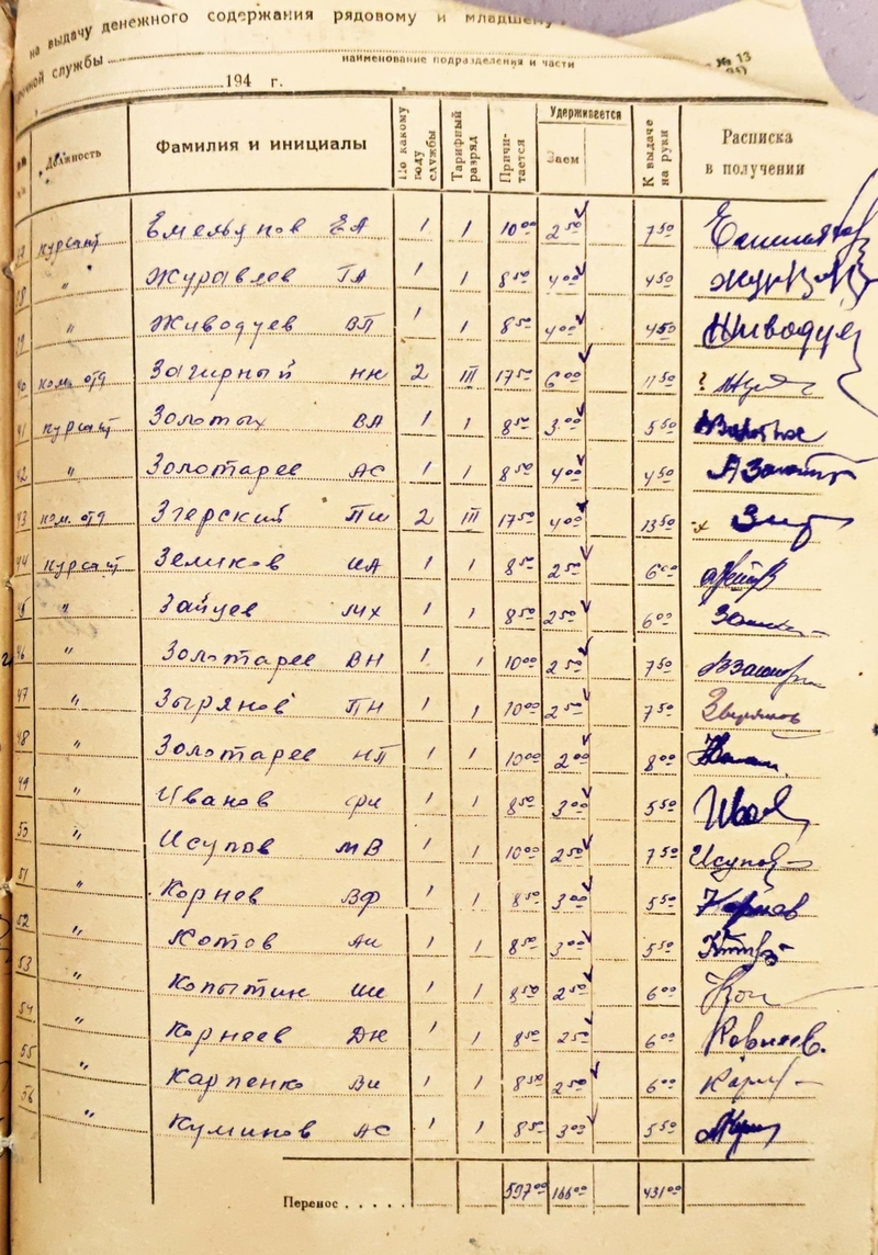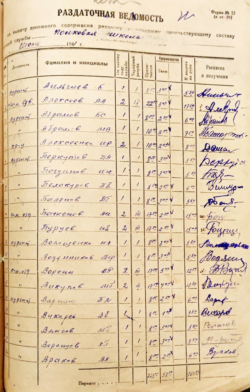 Расчётная ведомость полковой школы младшего командного состава (МКС) 576 стрелкового полка за июнь 1941 года. Воины записаны в алфавитном порядке.