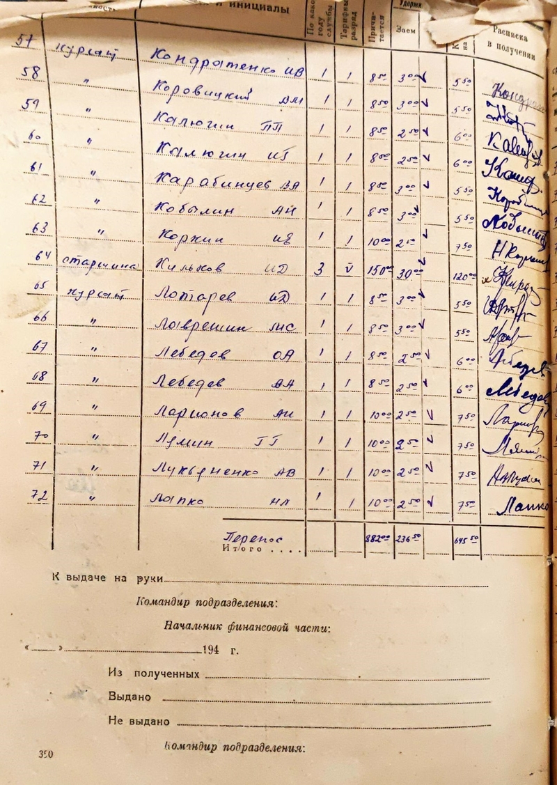 63) Курсант миномётного взвода Коркин И. Е. В расчётной ведомости за май числится Коркин Н. Е. В росписи также отчётливо видно имя «Н». Воин не идентифицирован.