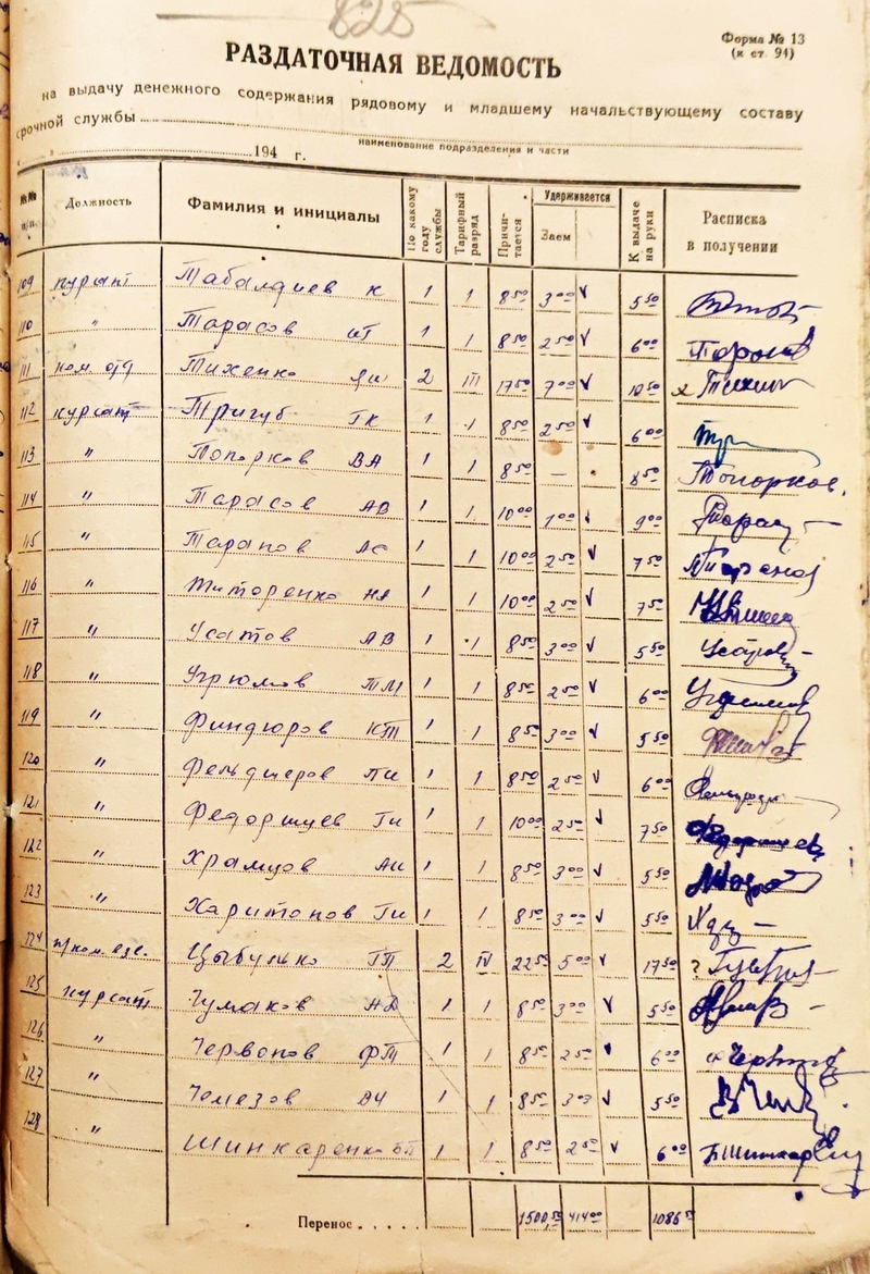 108) Курсант 1 стрелкового взвода Тарасенко В. Т. В расчётной ведомости за май 1941 года числится как Тарасенко В. П. Это Тарасенко Виктор Петрович 30.11.1921 г.р. Призван: __.10.1940 года, Ворошиловский РВК, Киргизская ССР, Фрунзенская обл., Ворошиловский р-н. Уроженец: Туркменская ССР, Марыйская обл., Тахта-Базарский р-н, п.г.т. Кушка. Воевал. Проходит как мл. лейтенант. Награждался в 1943 и 1944 годах. В 1945 проходит по ЭГ по свидетельству о болезни. Войну прошёл.