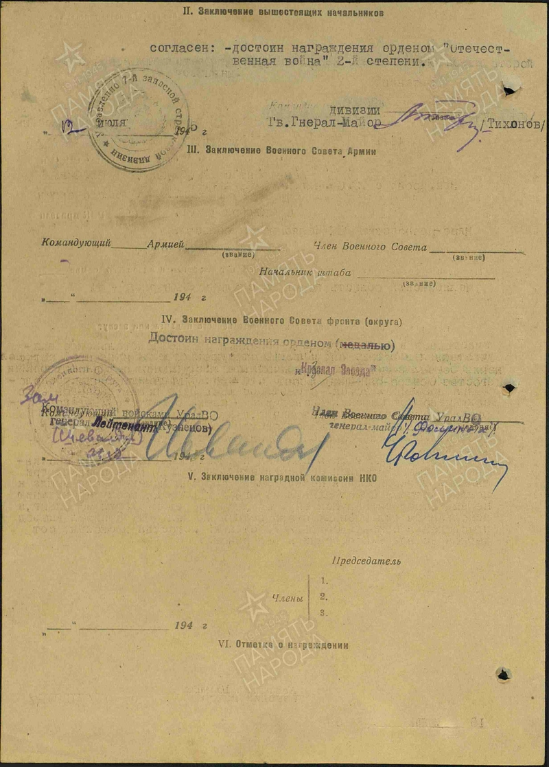 111) Командир 2 отделения 2 стрелкового взвода, сержант Тихенко Яков Иванович 1919 г.р. Уроженец: Украинская ССР, Черкасская обл., Городищенский р-н, с. Орловец. Ранен в бою. Проходит по ЭГ2222. Проходит по 36 зсбр 12.01.1942 года. Направлен в ЭГ50. Эвакуирован в тыл 09.04.1942 года из ЭГ1170. Больше информации нет. Вероятно, демобилизован по ранению. После войны награждался.