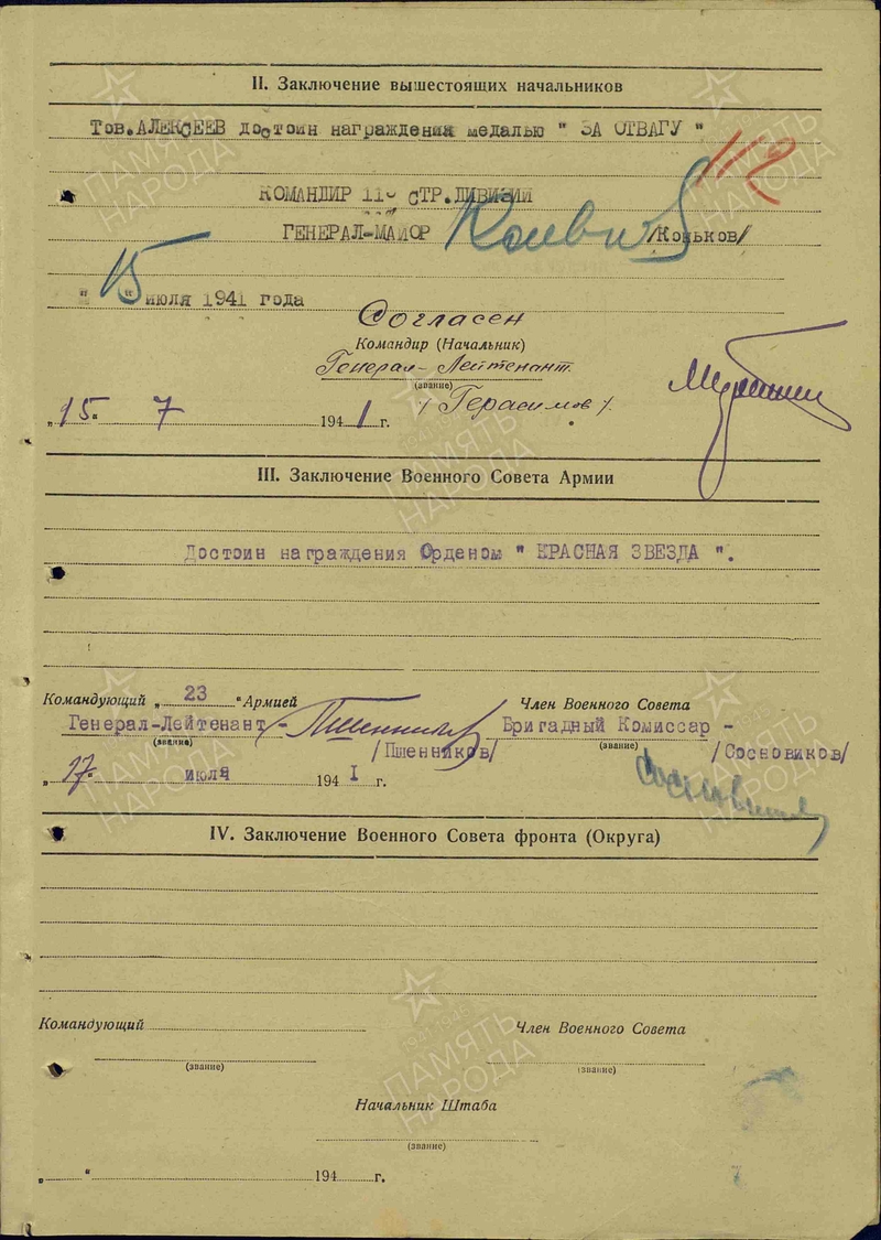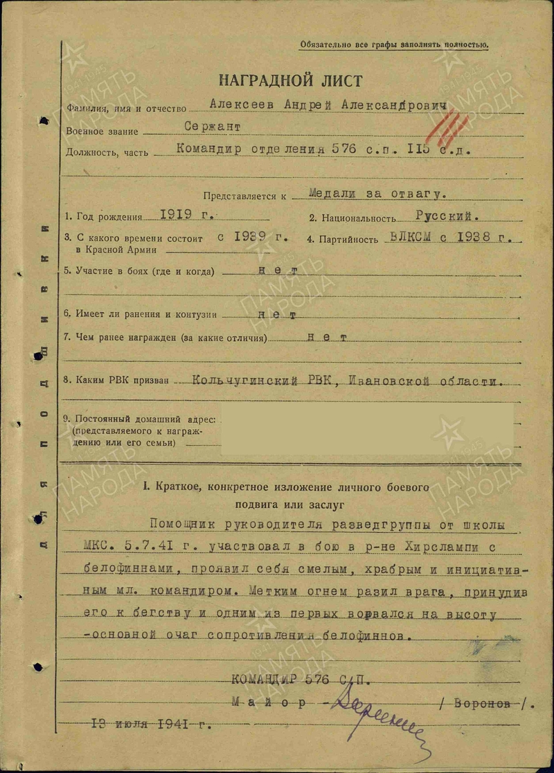 02) Помощник командира 3 стрелкового взвода, сержант Алексеев Андрей Александрович 1919 г.р. Призван: Кольчугинский РВК, Владимирская обл., Кольчугинский р-н. Уроженец: Ивановская обл., Кольчугинский р-н, Богородский с/с. Отец: Алексеев Александр Васильевич. Письменная связь прекратилась в октябре 1941 года. По спискам Кольчугинского РВК считается пропавшим без вести. Награждён.