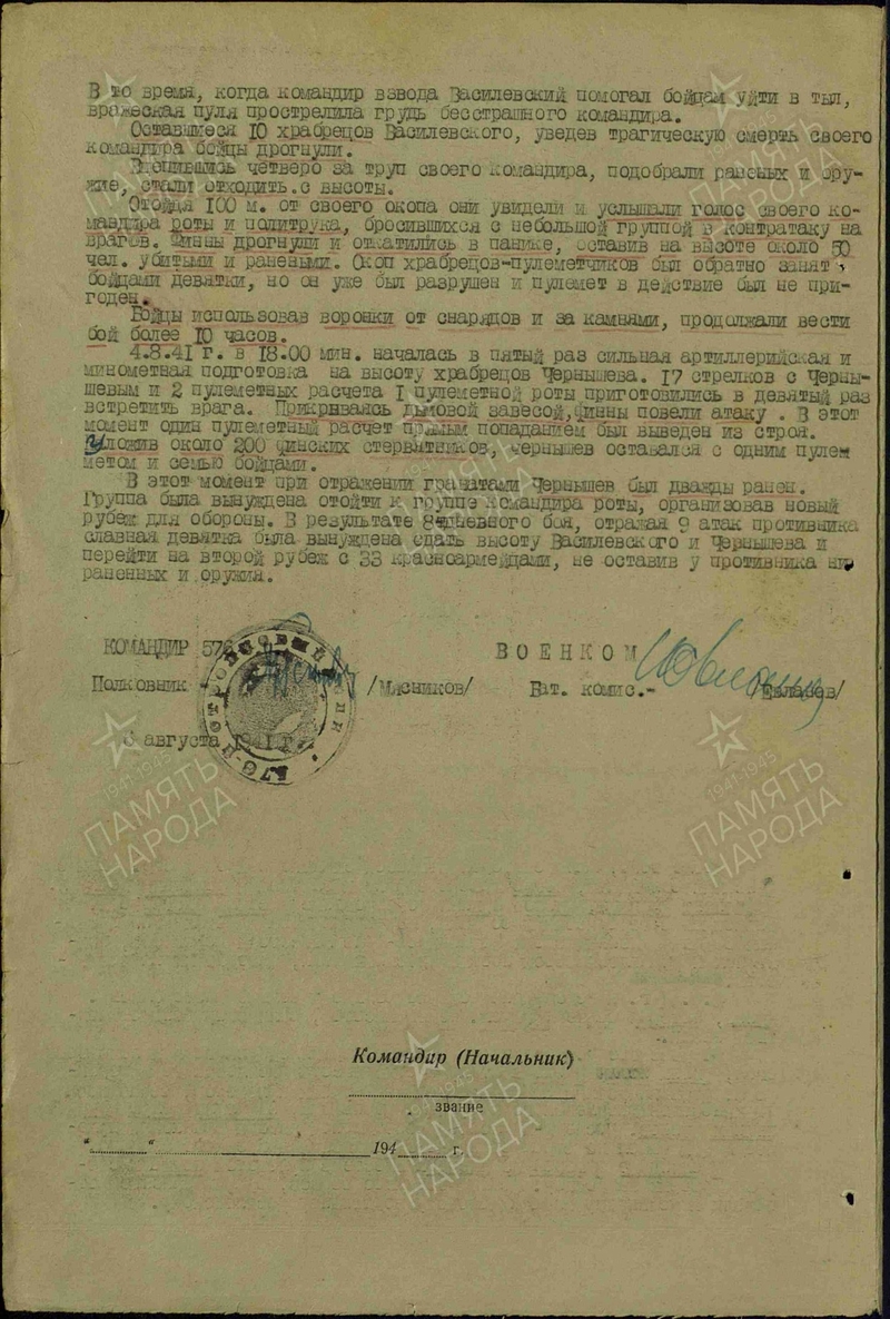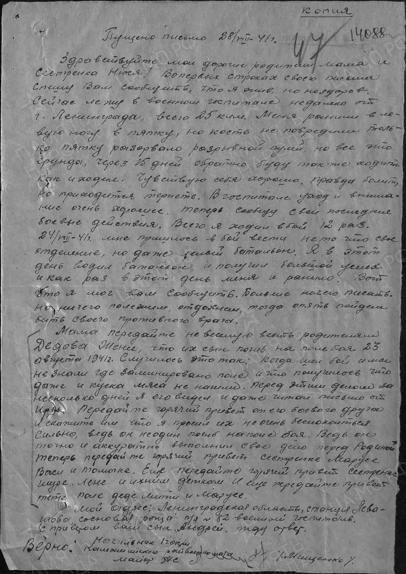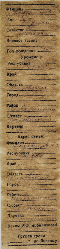 Командир 2 стрелкового взвода мл. лейтенант Воронов Иосиф Никанорович 30.03.1911 г.р. Уроженец: Калининская обл., Октябрьский р-н. д. Белянко. Жена: Семёнова Мария Семёновна. Пропал без вести 31.08.1941г. при выходе из окружения.