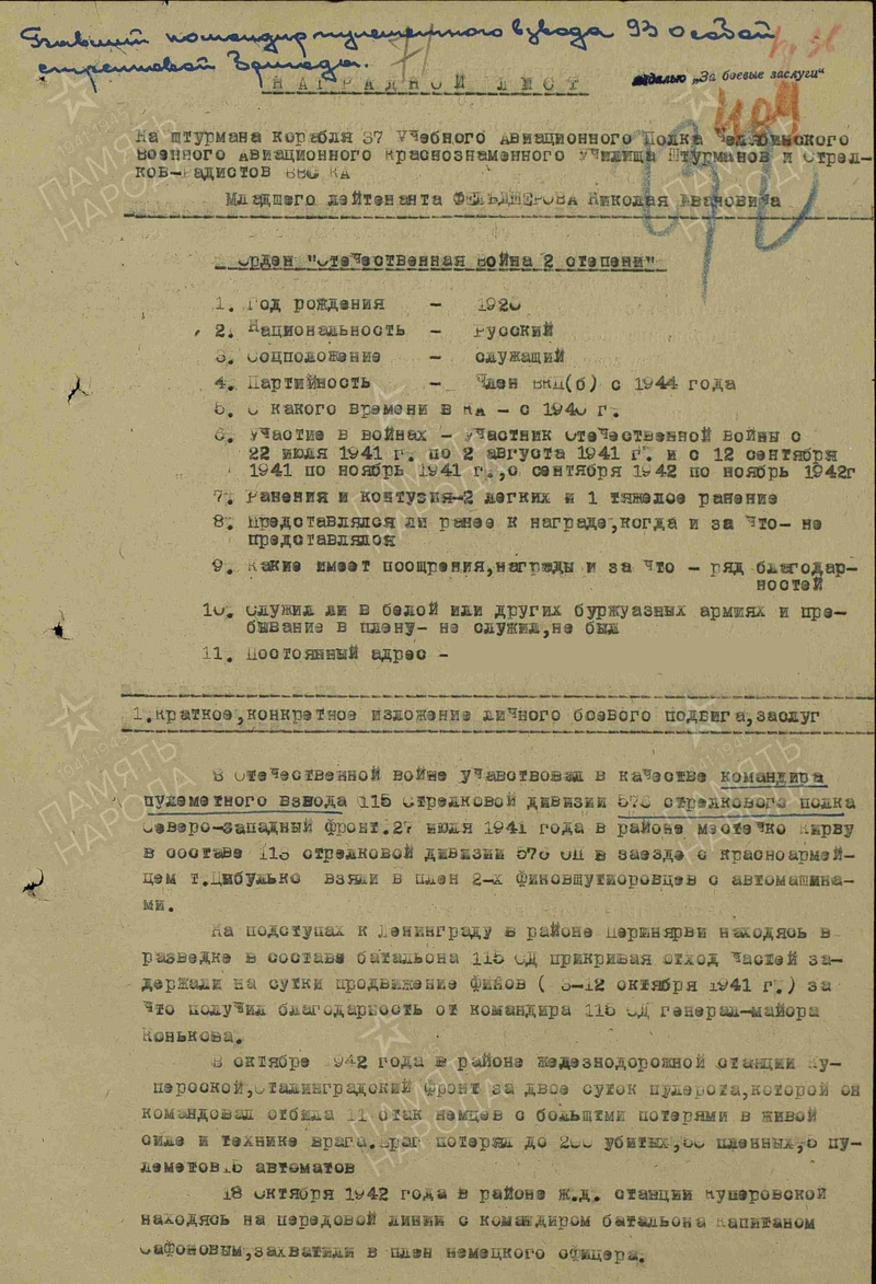 120) Курсант пулемётного взвода Фельдшеров П. И. В расчётной ведомости за май 1941 года числится как Фельдшеров Н. И. Это Фельдшеров Николай Иванович 21.03.1920 г.р. Призван: в 1940 году, Нязепетровский РВК, Челябинская обл., Нязепетровский р-н. Уроженец: Челябинская обл., Нязепетровский р-н. Ранен в бою в августе 1941 года. Проходит по ЭГ2222, выбыл 21.08.1941 года в ВСП918. В дальнейшем воевал. Награждён. Боевой путь читать в наградном листе. Войну прошёл.