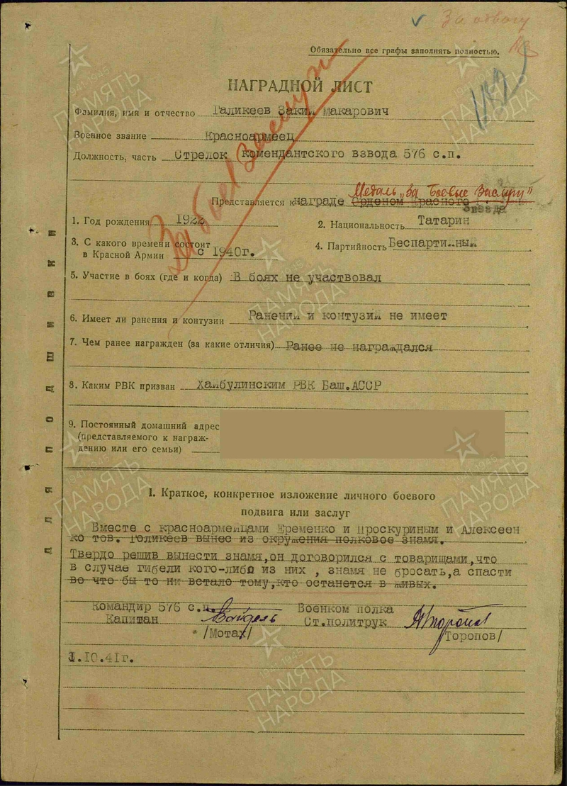 24) Курсант 2 стрелкового взвода Галикеев Закий Макарович 1922 г.р. Призван: в сентябре 1940 года, Хайбуллинский РВК, Башкирская АССР, Хайбуллинский р-н. Уроженец: Башкирская АССР, Чишминский р-н, д. Еремеево. Воевал. Вынес из окружения знамя 576 полка. Награждён. Войну прошёл.