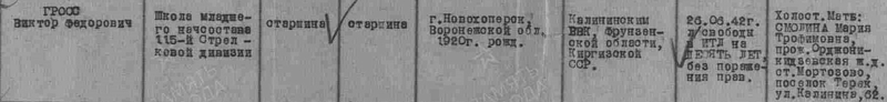 23) Курсант 1 стрелкового взвода Гросс Виктор Фёдорович 1920 г.р. Призван: Калининский РВК, Киргизская ССР, Фрунзенская обл., Калининский р-н. Уроженец: Воронежская обл., г. Новохоперск. Осужден 26.06.1942 года.