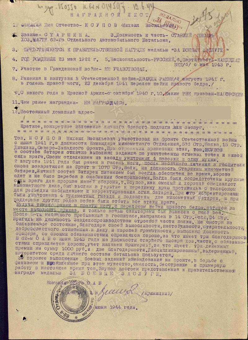 50) Курсант миномётного взвода Исупов Михаил Васильевич 23.05.1922г.р. Призван: Нагорский РВК, Кировская обл., Нагорский р-н. Уроженец: Кировская обл., Нагорский р-н, д. Ивановцы. Ранен в бою 02 августа 1941 года в Куйсма. Проходит по ЭГ2222, выбыл 04.08.1941 года в ВСП319. В дальнейшем ранен 23 декабря 1941 года. На войну вернулся 27.06.1943 года. Воевал. Награждён. Член ВКПБ. Войну прошёл.