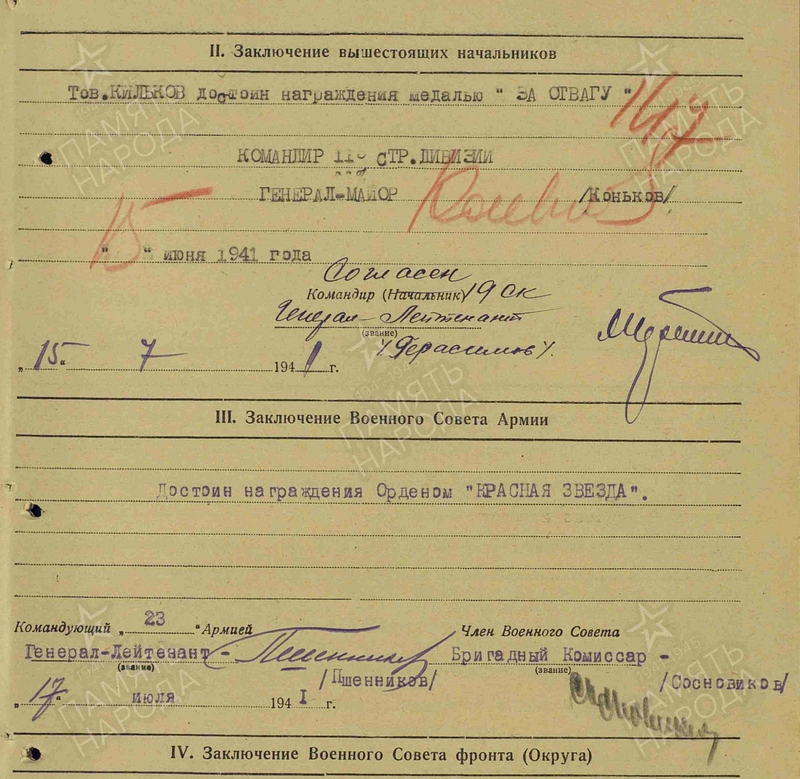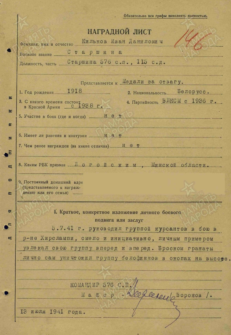 64) Старшина Кильков Иван Данилович 1918 г.р. Призван: Логойский РВК, Белорусская ССР, Минская обл., Логойский р-н. По другим данным призван: Чаусский РВК, Белорусская ССР, Могилевская обл., Чаусский р-н. Уроженец: Белорусская ССР, Могилевская обл., Чаусский р-н, Темнолесье. Мать: Килькова Анна Павловна. Письменная связь прекратилась в августе 1941 года. По спискам Чаусского РВК за 1948 год считался пропавшим без вести. Стоит рукописная пометка «Погиб 15.11.1941 года». Награждён орденом Красной Звезды за бой в Хирслампи в июле 1941 года.