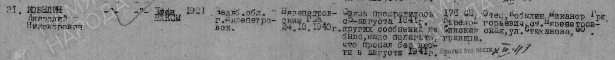 62) Курсант пулемётного взвода Кобылин Анатолий Никанорович 1921 г.р. Призван: 24.10.1940 года, Нязепетровский РВК, Челябинская обл., Нязепетровский р-н. Уроженец: Челябинская обл., Нязепетровский р-н, г. Нязепетровск. Отец: Кобылин Никанор Григорьевич. Письменная связь прекратилась в августе 1941 года из «КФССР, граница». Полк 176 указан не достоверно, правильно 576 полк. По спискам Нязепетровского РВК за 1947 год считается пропавшим без вести. Пропал без вести (погиб) в августе 1941 года.