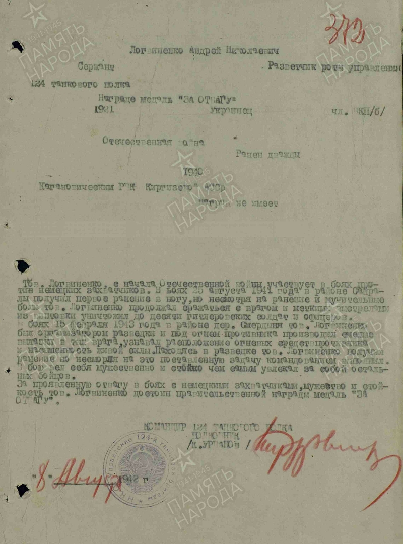73) Курсант миномётного взвода Логвиненко Андрей Николаевич 1921 г.р. Призван: 17.10.1940 года, Кагановичский РВК, Киргизская ССР, Кагановичский р-н. Уроженец: Киргизская ССР, Фрунзенская обл., Кагановический р-н. Ранен в бою 25 августа 1941 года. Проходит по госпиталям. Выбыл 11.09.1941 г. из ЭГ2764 в БВ. Проходит 18.09.1941 г. по 36 зсбр, выбыл в 56 одсб. В дальнейшем воевал командиром отделения разведчиков 124 отдельного танкового полка. Награждён. Войну прошёл.