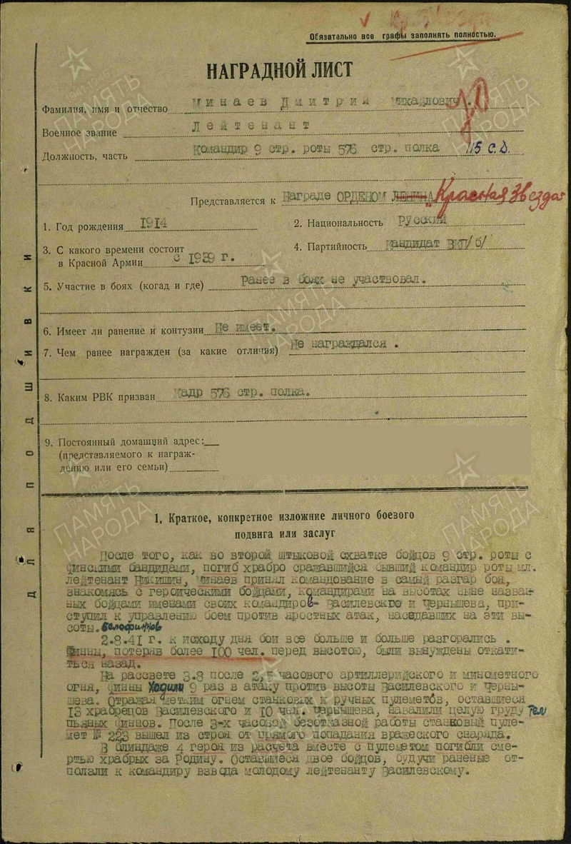 Командир 3 взвода лейтенант Минаев Дмитрий Михайлович 11.10.1914 г.р. Уроженец: Рязанская обл., Шиловский р-н, с. Поляки. Жена: Минаева Александра Андреевна. Ранен в бою в августе 1941г. Проходит по госпиталям. За оборону высот в Куйсма лейтенант Минаев Дмитрий Михайлович награждён орденом Красной Звезды. Он героически погибнет в 1943 г. командиром 1 батальона 708 СП в звании капитан.