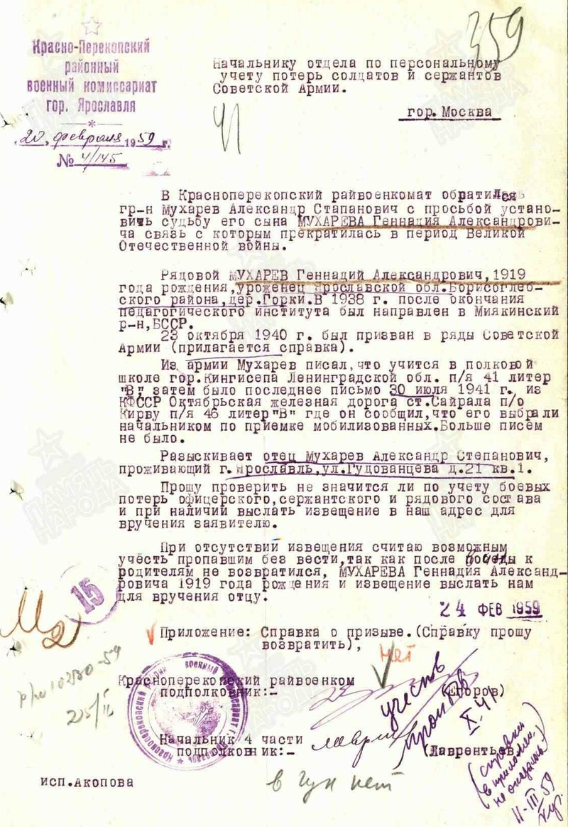 76) Курсант 3 стрелкового взвода Мухарёв Геннадий Александрович 1919 г.р. Призван: 23.10.1940 года, вероятно, Миякинский РВК, Белорусская ССР, Миякинский р-н. Уроженец: Ярославская обл., Борисоглебский р-н, д. Горки. Отец: Мухарёв Александр Степанович. Письменная связь прекратилась 30.07.1941 года с адреса п/о Кирву, п/я 46 (адрес 115 СД). По анкете РВК г. Ярославля за 1959 год считается пропавшим без вести. Пропал без вести (погиб) в августе 1941 года.