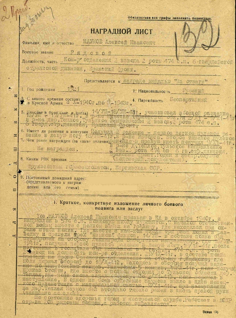 85) Курсант пулемётного взвода Наумов Алексей Иванович 1921 г.р. Призван: в октябре 1940 года, Ворошиловский РВК, Киргизская ССР, Фрунзенская обл., Ворошиловский р-н. Ранен в бою 18 августа 1941 года. Проходит по ЭГ2222, выбыл в ВСП18. В дальнейшем воевал. Демобилизован по ранению. Награждён. Войну прошёл.
