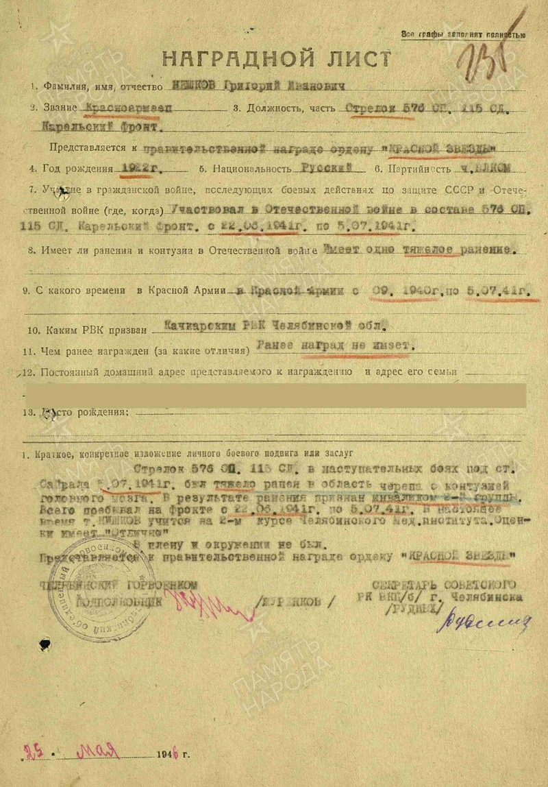 83) Курсант 3 стрелкового взвода Нешков Григорий Иванович 15.09.1922г.р. Призван: 15.09.1940 года, Кочкарский РВК, Челябинская обл., Кочкарский р-н. Уроженец: Брянская обл., Стародубский р-н, д. Крюково. Тяжело ранен в бою в районе Хирслампи 05.07.1941 года. Проходит по госпиталям. Демобилизован по ранению 15.01.1942 года. Награждён. Войну прошёл.