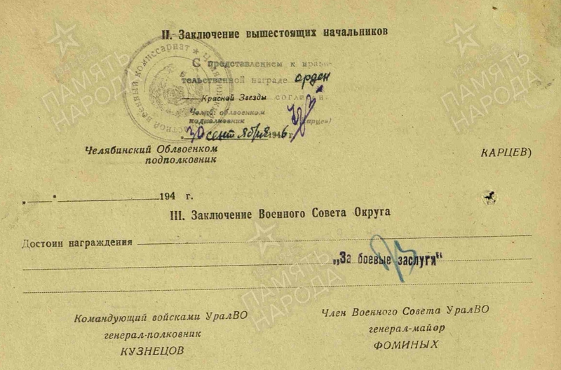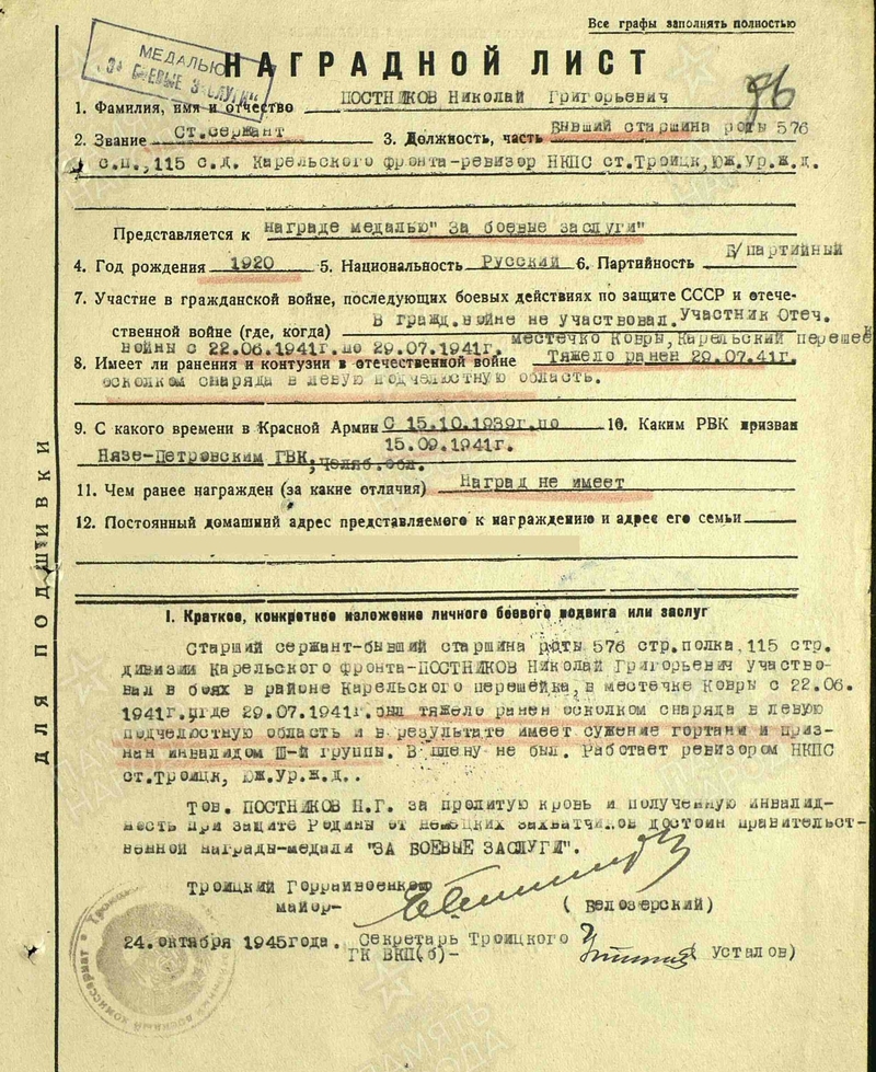 88) Курсант 2 стрелкового взвода Постников Николай Григорьевич 1920 г.р. Призван: в 15.10.1940 года, Нязепетровский РВК, Челябинская обл., Нязепетровский р-н. Уроженец: Челябинская обл., г. Нязепетровск. Тяжело ранен в бою 29 июля 1941 года. Проходит по госпиталям. Демобилизован по ранению 15.09.1941 года. Награждён. Местечко «Ковры» следует читать как Кирву.