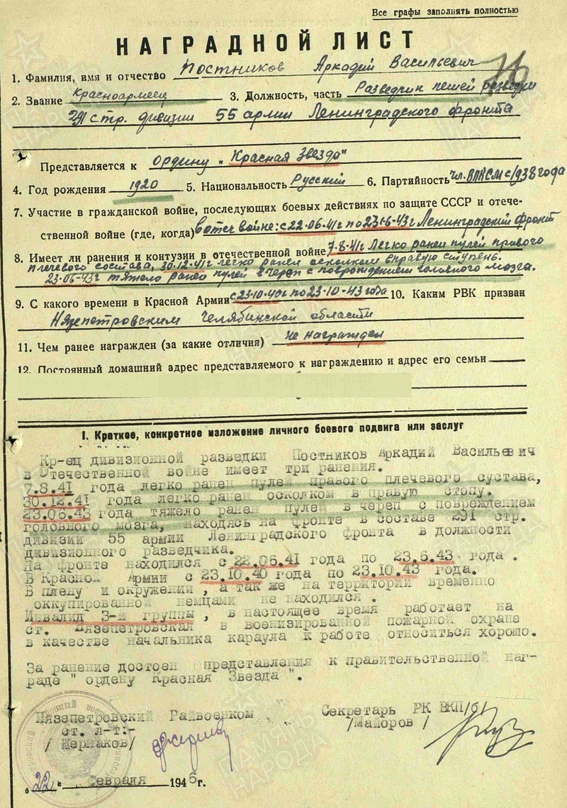 91) Курсант 3 стрелкового взвода Постников Аркадий Васильевич 1920г.р. Призван: 23.10.1940 года, Нязепетровский РВК, Челябинская обл., Нязепетровский р-н. Уроженец: Челябинская обл., Нязепетровский р-н, г. Нязепетровск. Ранен в бою 7 августа 1941 года. Проходит 07.08.1941 года по ЭГ2222. Проходит 16.09.1941 года по 36 зсбр. В дальнейшем воевал. Был тяжело ранен в 1943 году. Демобилизован по ранению. Награждён.