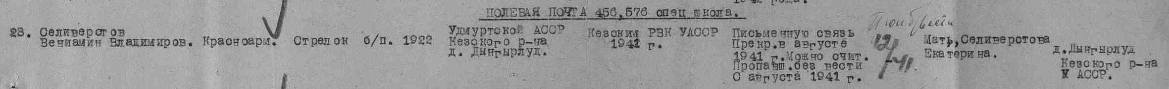 105) Курсант пулемётного взвода Селивёрстов Вениамин Владимирович 1922 г.р. Призван: 10.1940 года, Кезский РВК, Удмуртская АССР, Кезский р-н. Уроженец: Удмуртская АССР, Кезский р-н, д. Дынгырлуд. Мать: Селивёрстова Екатерина. Письменная связь прекратилась в августе 1941 года с адреса п/п 456, 576 спец школа. По спискам Кезского РВК за 1946 год считается пропавшим без вести. Пропал без вести (погиб) в августе 1941 года.