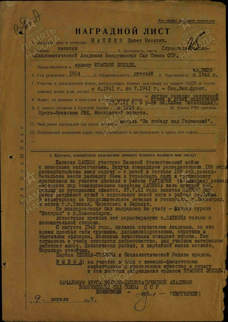 Командир 1 стрелкового взвода лейтенант Шапкин Павел Никитович (Никифорович) 04.02.1914г.р. Уроженец: Рязанская обл., Спас-Клепиковский р-н, д. Аристово. В июле 1941г. проходит командиром взвода 168 ОРБ 115СД. Ранен в бою 27.07.1941г. Проходит по ЭГ2222, выбыл в ВСП343 01.08.1941г. После госпиталя направлен на курсы в г. Новосибирск. Награждён. (Читать наградной лист). Войну прошёл.
