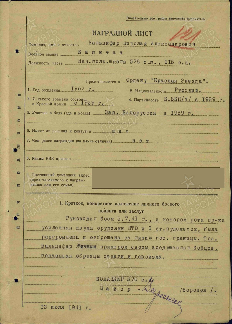 Начальник школы МКС 576СП капитан Вальцифер Николай Александрович 1907 г.р. Уроженец: Калининская обл., Ржевский р-н. д. Горки. Жена: Вальцифир Анастасия Артёмовна. Воевал. Награждён. В дальнейшем числится зам. начальника разведотдела штаба 67А в звании подполковник. Погиб в бою 19.08.1943г. в Мгинском районе Лен. обл., Рабочий посёлок №6. За бой в Хирслампи 05.07.1941 года награждён орденом Красной Звезды.