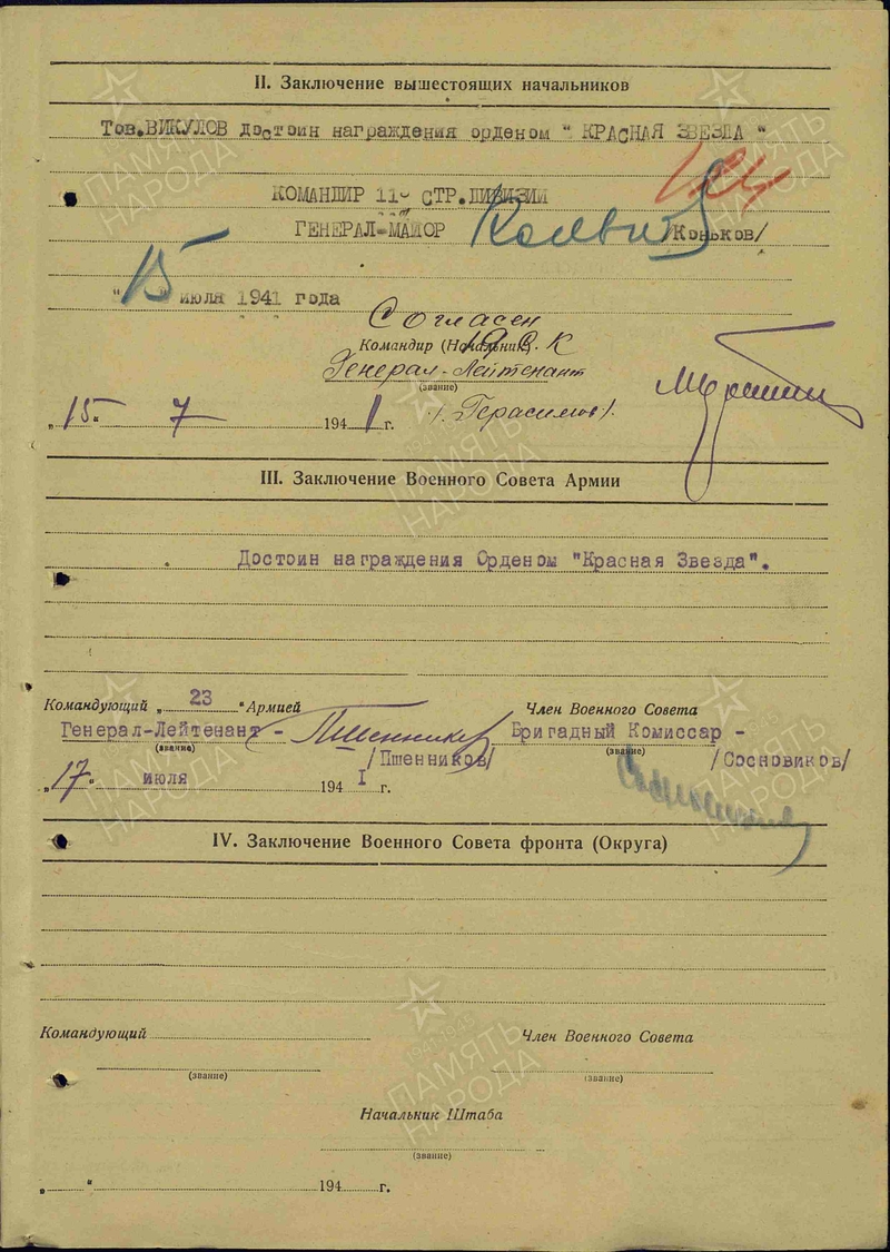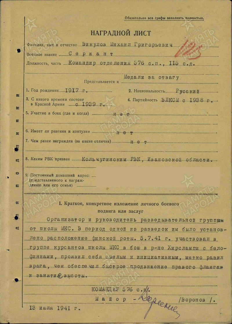 15) Командир отделения 1 стрелкового взвода, сержант Викулов Михаил Григорьевич 17.05.1917г.р. Призван: 15.12.1939 года, Кольчугинский РВК, Ивановская обл., Кольчугинский р-н. Уроженец: Владимирская обл., Киржачский р-н, д. Афанасово. Ранен в бою в августе 1941 года. Из госпиталя выбыл 02.09.1941 года. В дальнейшем проходит как мл. лейтенант. Воевал. Был ранен в 1942 году. Воевал. Был тяжело ранен в 1944 году. Службу закончил, находился в госпитале. Демобилизован в январе 1946 года.