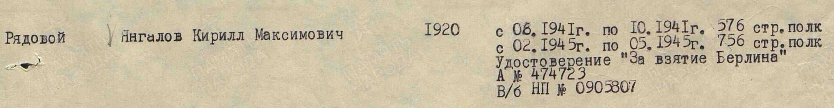 134) Курсант 3 стрелкового взвода Янгалов Кирилл Максимович 05.07.1920 г.р. Уроженец: Башкирская АССР, г. Стерлитамак. Ранен в бою. Вероятно, демобилизован по ранению. В феврале 1945 года признан «к строевой» и призван вновь. Войну прошёл.