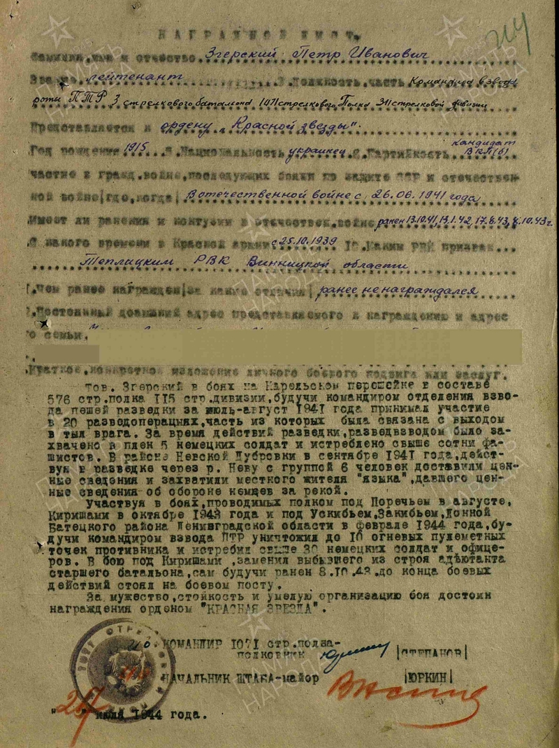 43) Командир отделения 2 стрелкового взвода, сержант Згерский Пётр Иванович 26.12.1915г.р. Призван: 10.10.1939 года, Тепликский РВК, Украинская ССР, Винницкая обл., Тепликский р-н. Уроженец: Украинская ССР, Черниговская обл., Ичнянский р-н, с. Буромка. Ранен в бою в октябре 1941 года. В феврале 1943 окончил курсы мл. лейтенантов. Воевал. Награждён. Войну прошёл.